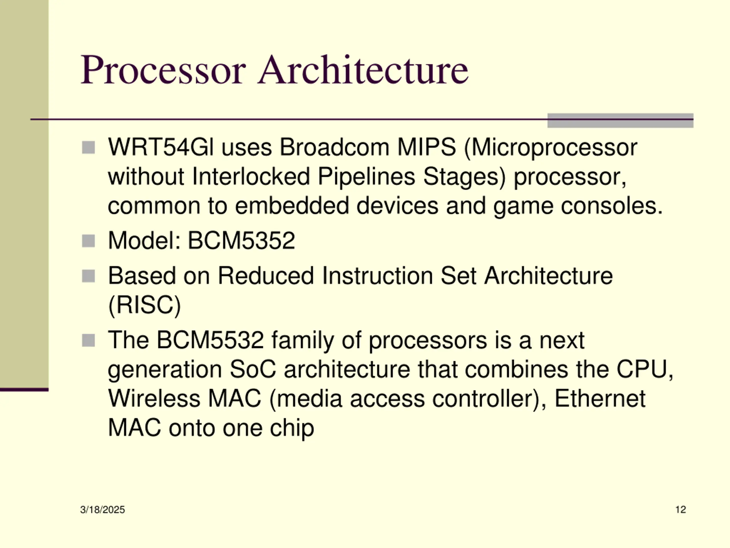 Processor Architecture WRT54Gl uses Broadcom MIPS (Microprocessor without Interlocked Pipelines Stages) processor, common to embedded devices and game consoles. Model: BCM5352 Based on Reduced Instruction Set Architecture (RISC) The BCM5532 family of processors is a next generation SoC architecture that combines the CPU, Wireless MAC (media access controller), Ethernet MAC onto one chip 12 3/18/2025