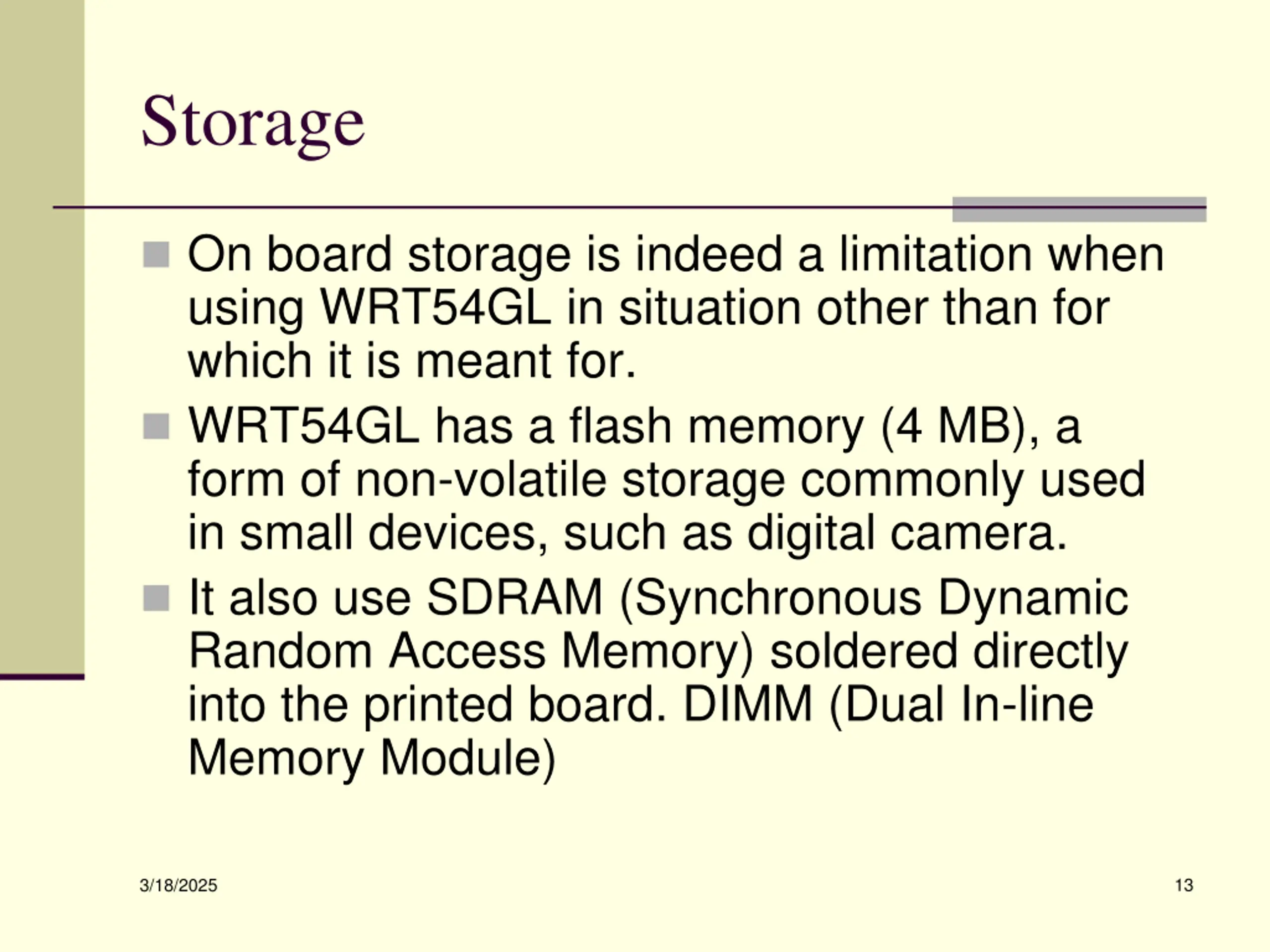 Storage On board storage is indeed a limitation when using WRT54GL in situation other than for which it is meant for. WRT54GL has a flash memory (4 MB), a form of non-volatile storage commonly used in small devices, such as digital camera. It also use SDRAM (Synchronous Dynamic Random Access Memory) soldered directly into the printed board. DIMM (Dual In-line Memory Module) 13 3/18/2025
