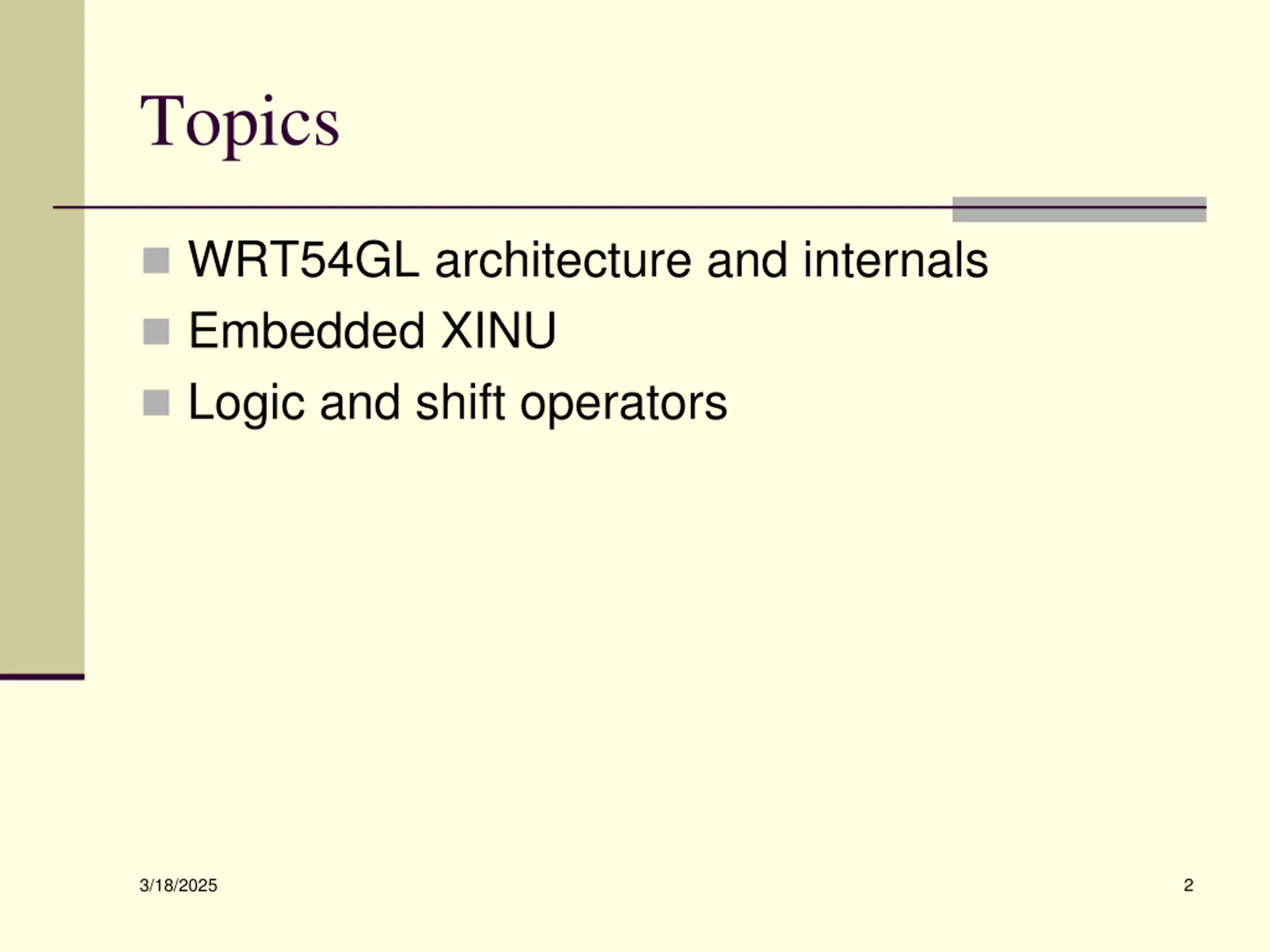 Topics WRT54GL architecture and internals Embedded XINU Logic and shift operators 2 3/18/2025