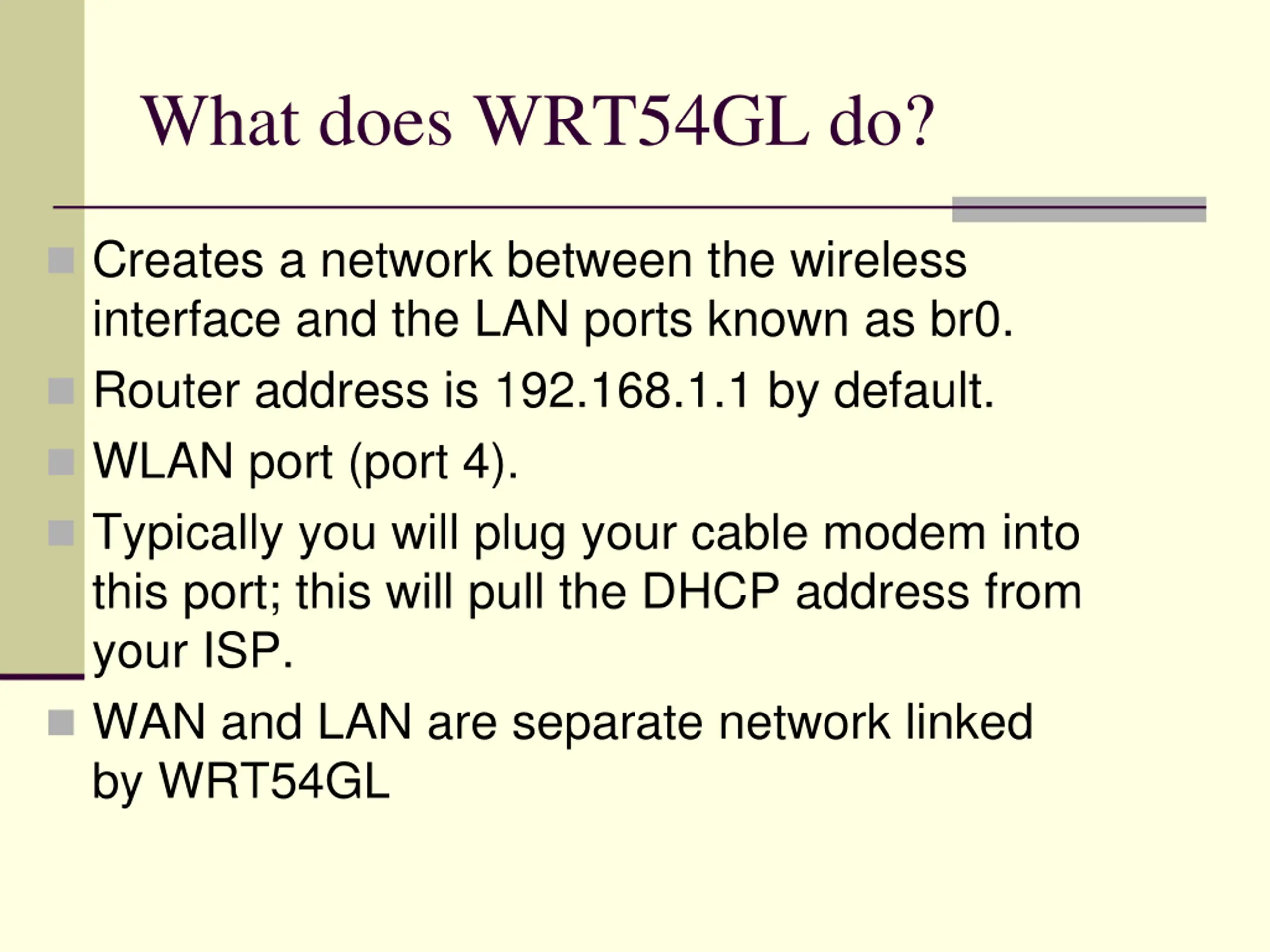 What does WRT54GL do? Creates a network between the wireless interface and the LAN ports known as br0. Router address is 192.168.1.1 by default. WLAN port (port 4). Typically you will plug your cable modem into this port; this will pull the DHCP address from your ISP. WAN and LAN are separate network linked by WRT54GL