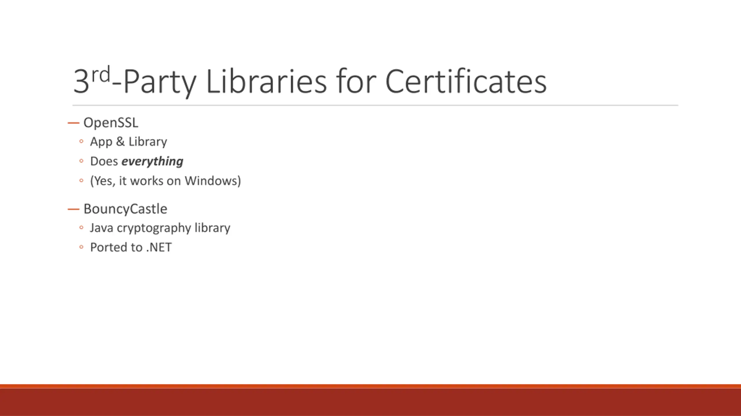 3rd-Party Libraries for Certificates OpenSSL App & Library Does everything (Yes, it works on Windows) BouncyCastle Java cryptography library Ported to .NET