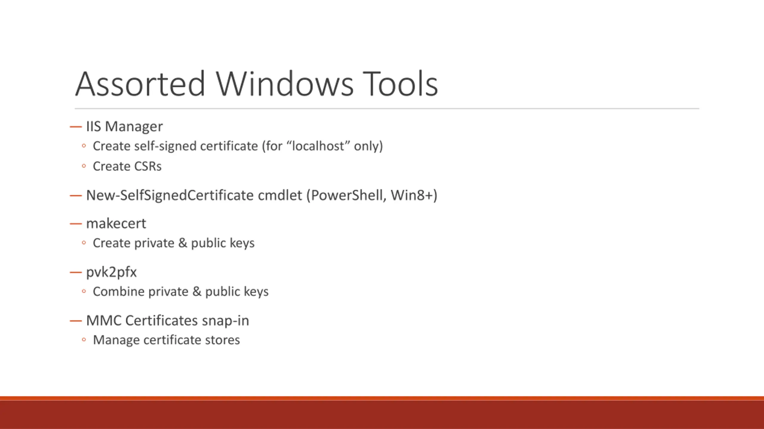 Assorted Windows Tools IIS Manager Create self-signed certificate (for localhost only) Create CSRs New-SelfSignedCertificate cmdlet (PowerShell, Win8+) makecert Create private & public keys pvk2pfx Combine private & public keys MMC Certificates snap-in Manage certificate stores