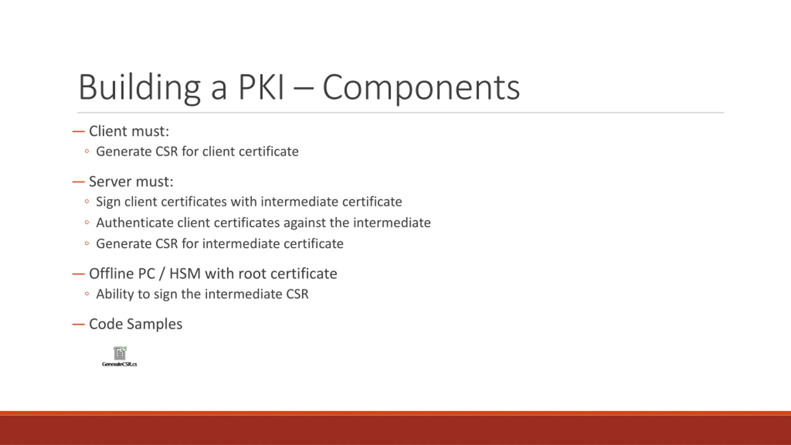 Building a PKI Components Client must: Generate CSR for client certificate Server must: Sign client certificates with intermediate certificate Authenticate client certificates against the intermediate Generate CSR for intermediate certificate Offline PC / HSM with root certificate Ability to sign the intermediate CSR Code Samples
