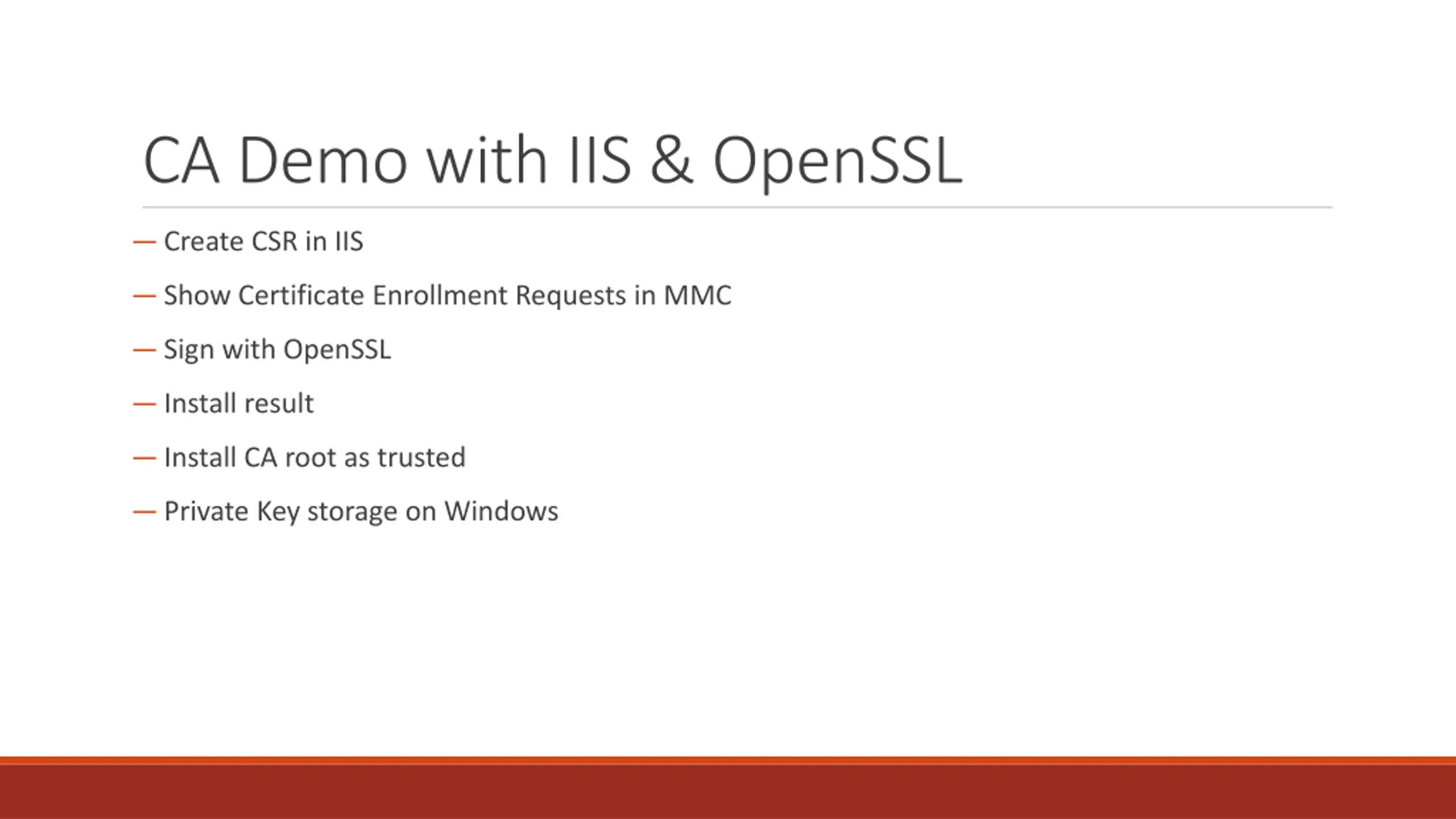 CA Demo with IIS & OpenSSL Create CSR in IIS Show Certificate Enrollment Requests in MMC Sign with OpenSSL Install result Install CA root as trusted Private Key storage on Windows