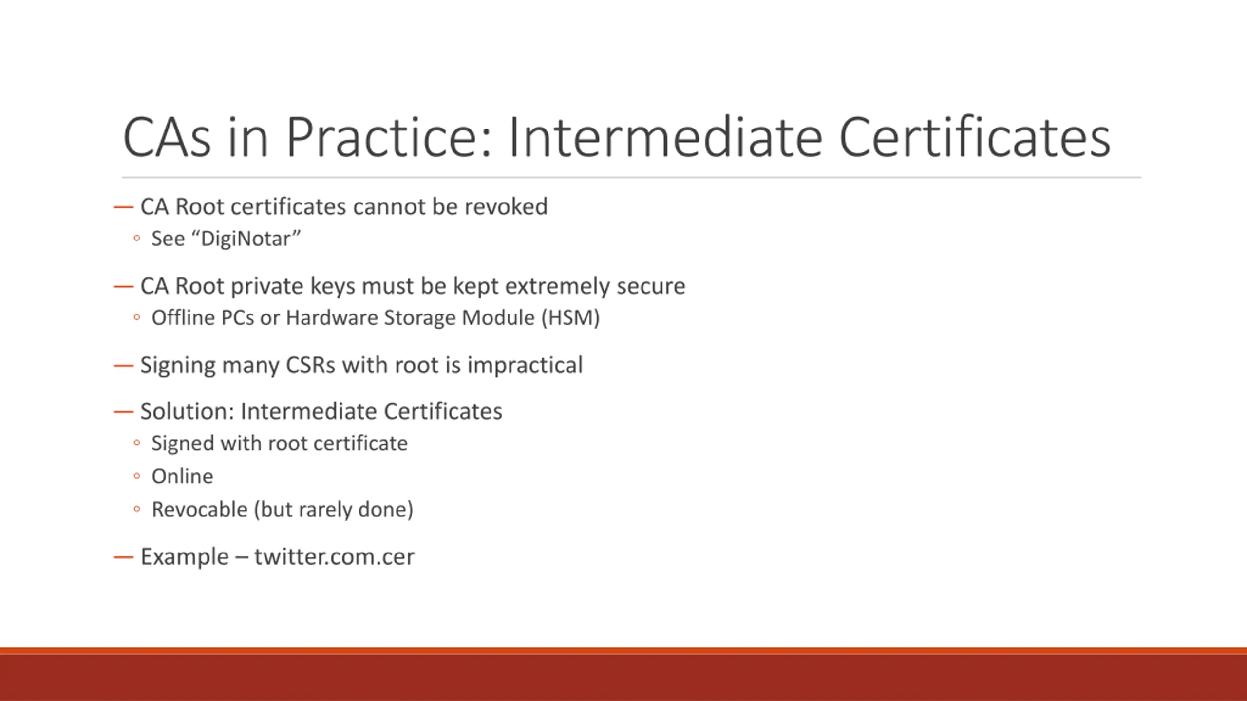 CAs in Practice: Intermediate Certificates CA Root certificates cannot be revoked See DigiNotar CA Root private keys must be kept extremely secure Offline PCs or Hardware Storage Module (HSM) Signing many CSRs with root is impractical Solution: Intermediate Certificates Signed with root certificate Online Revocable (but rarely done) Example twitter.com.cer