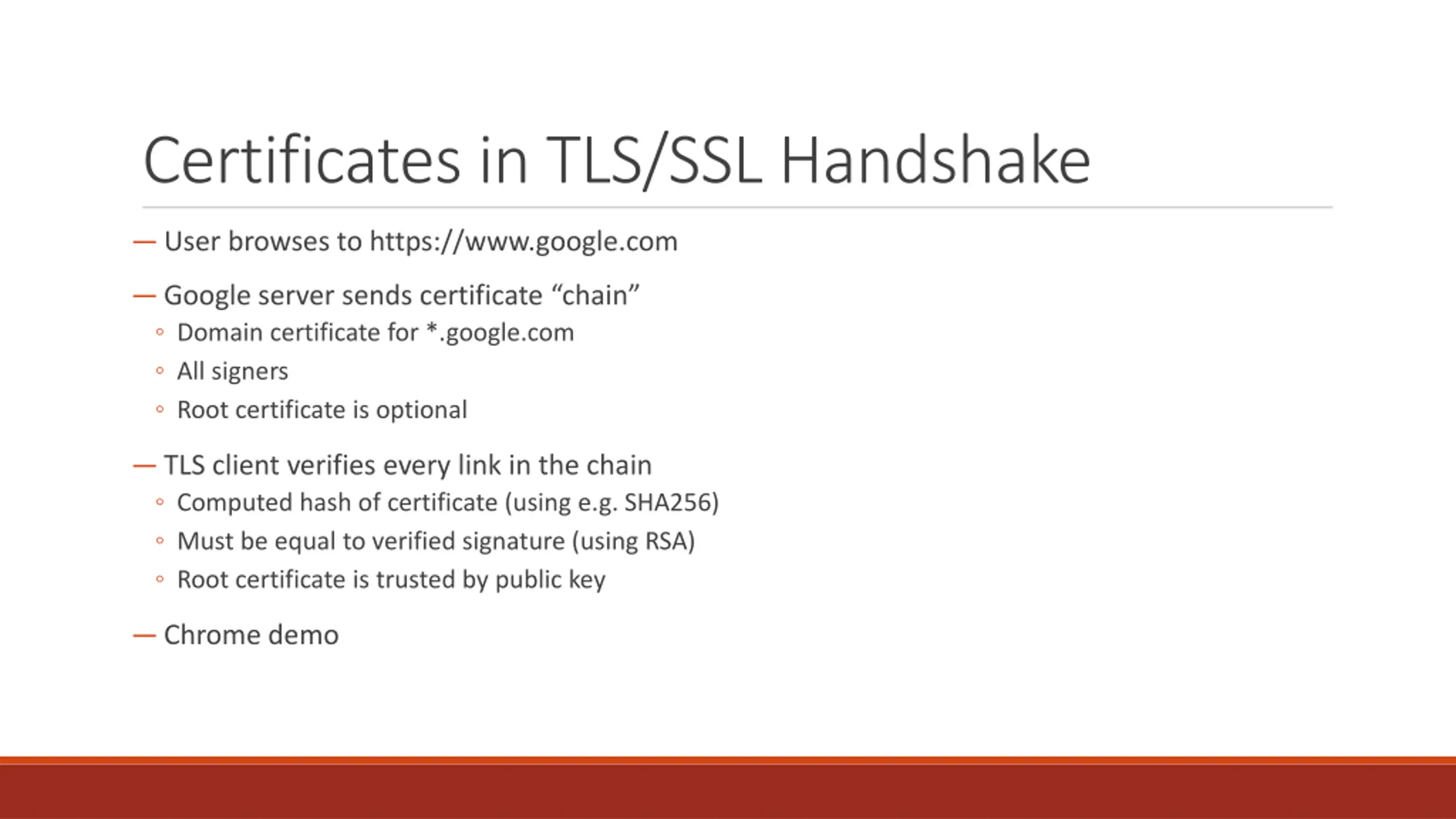 Certificates in TLS/SSL Handshake User browses to https://www.google.com Google server sends certificate chain Domain certificate for *.google.com All signers Root certificate is optional TLS client verifies every link in the chain Computed hash of certificate (using e.g. SHA256) Must be equal to verified signature (using RSA) Root certificate is trusted by public key Chrome demo