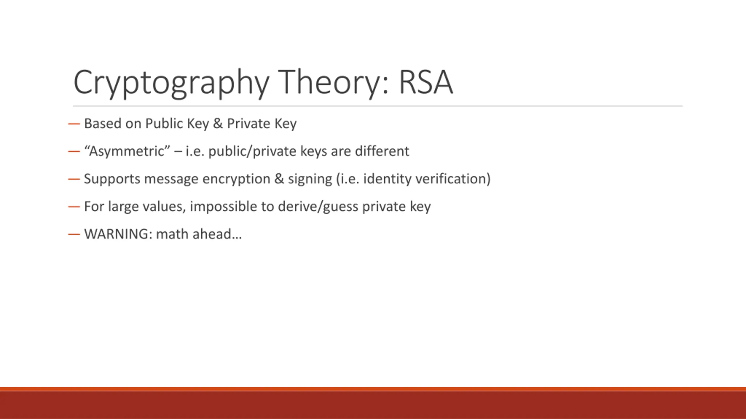 Cryptography Theory: RSA Based on Public Key & Private Key Asymmetric i.e. public/private keys are different Supports message encryption & signing (i.e. identity verification) For large values, impossible to derive/guess private key WARNING: math ahead