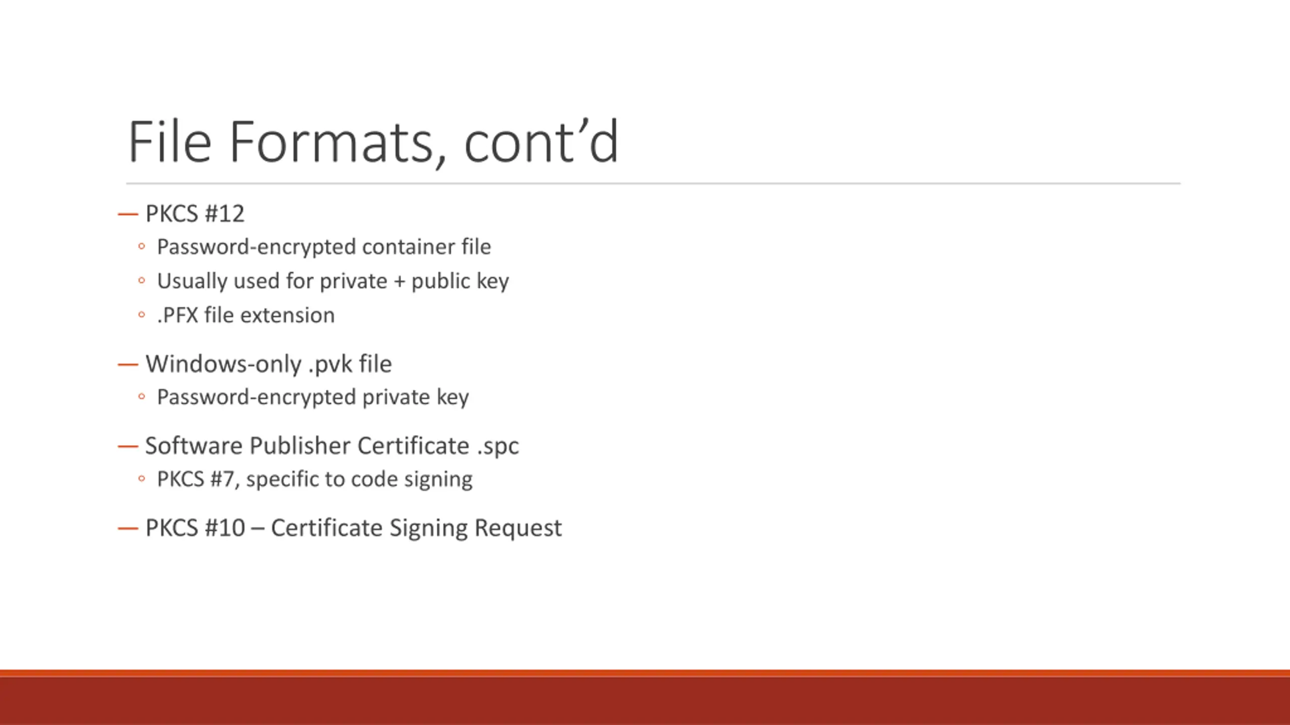 File Formats, contd PKCS #12 Password-encrypted container file Usually used for private + public key .PFX file extension Windows-only .pvk file Password-encrypted private key Software Publisher Certificate .spc PKCS #7, specific to code signing PKCS #10 Certificate Signing Request