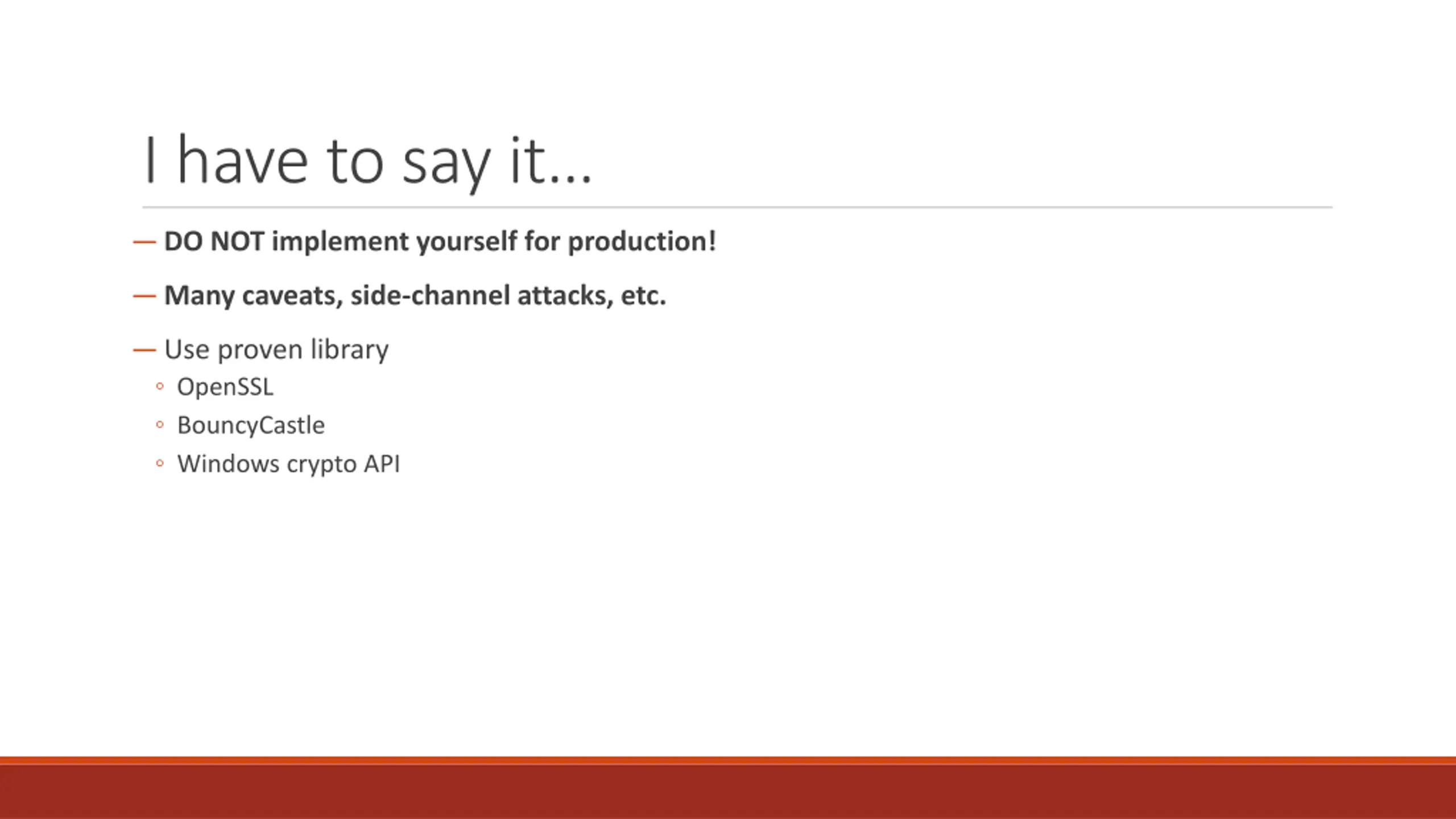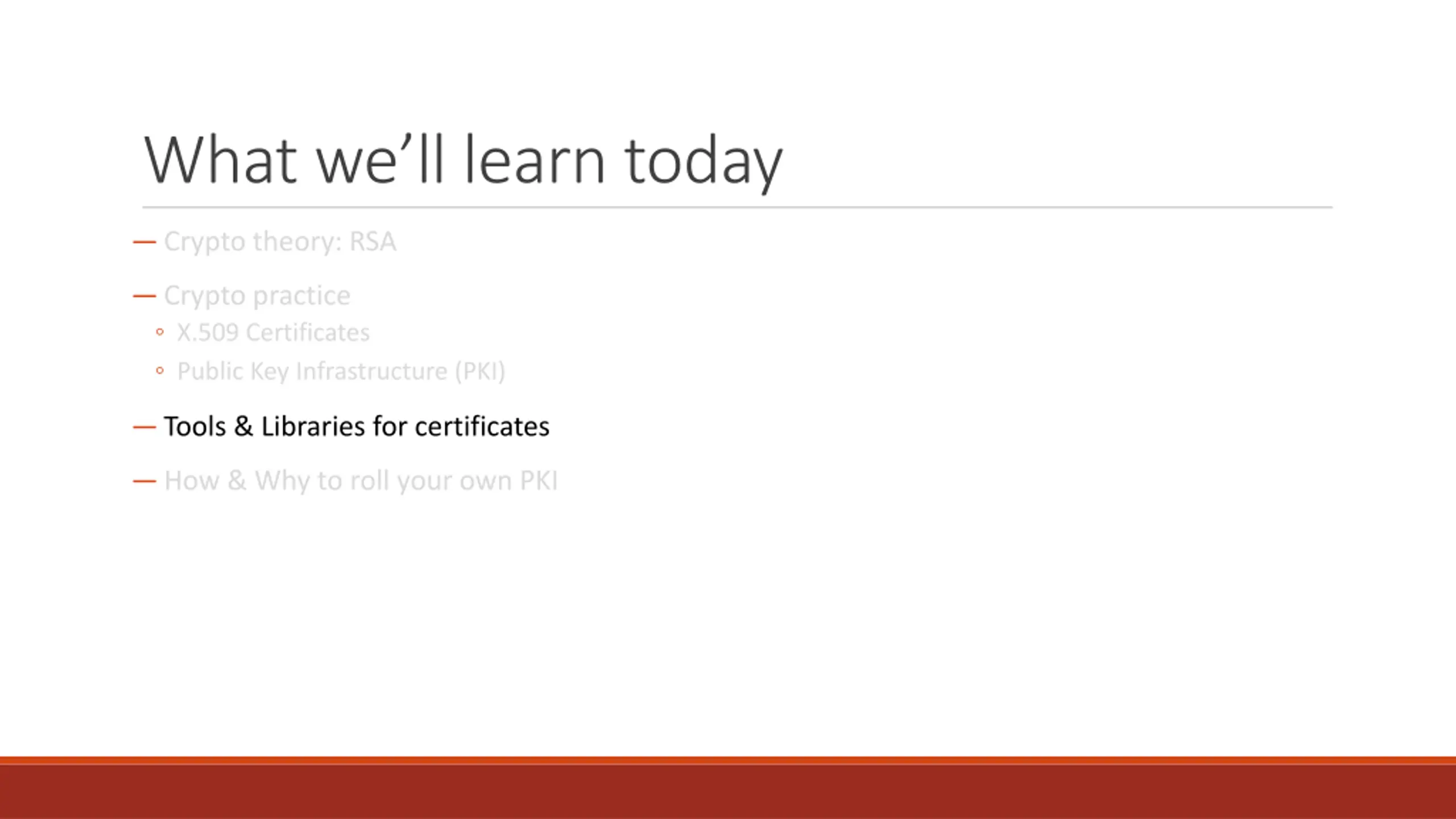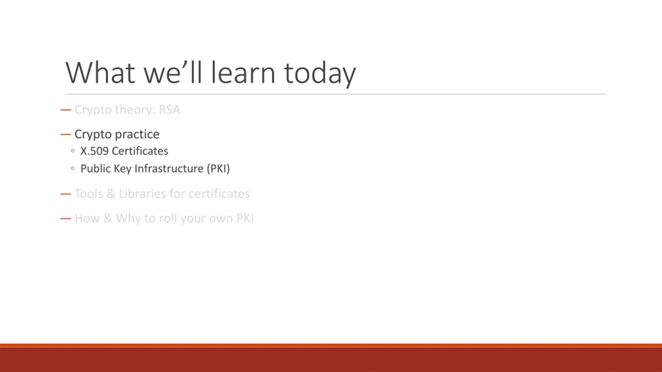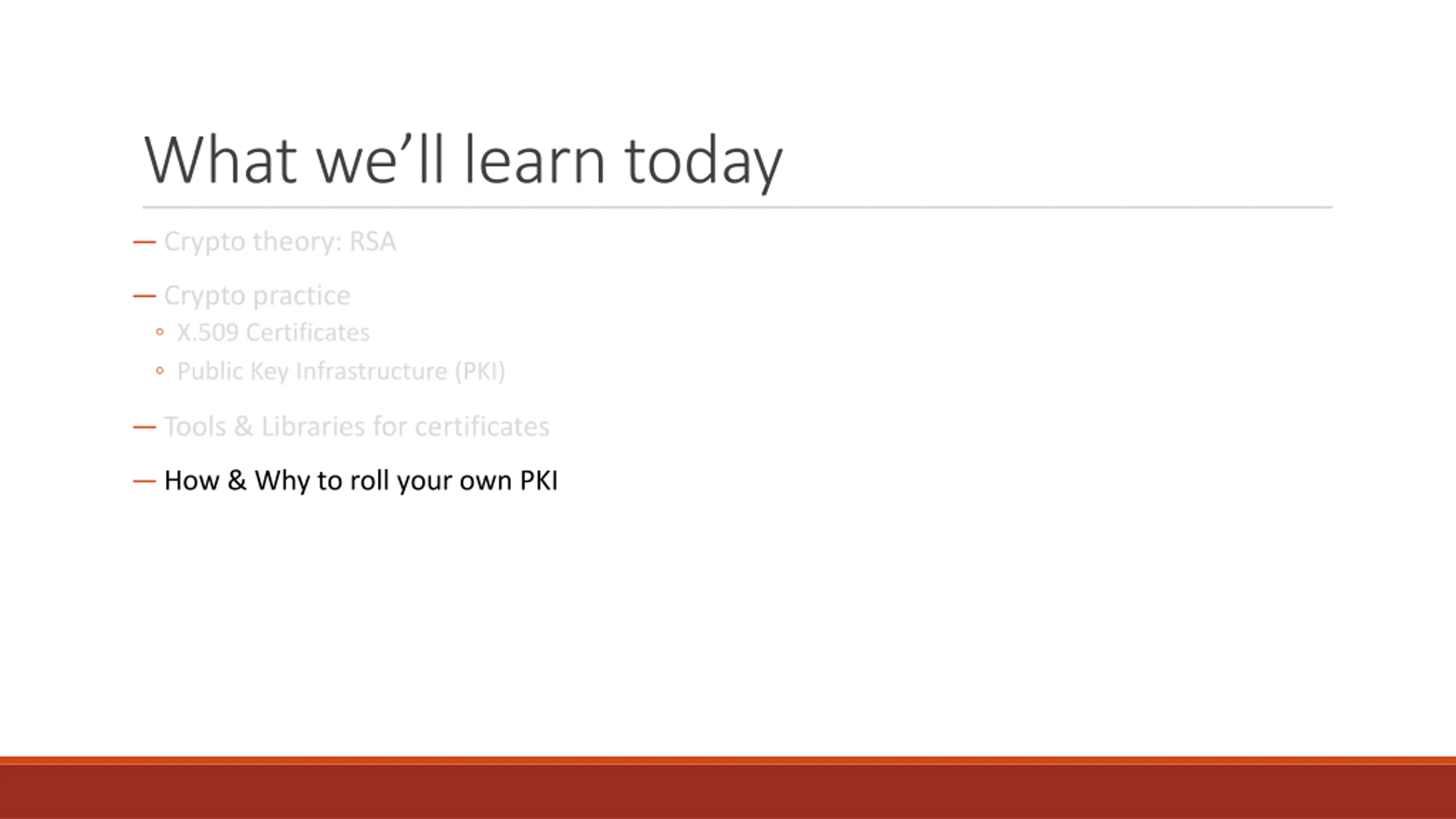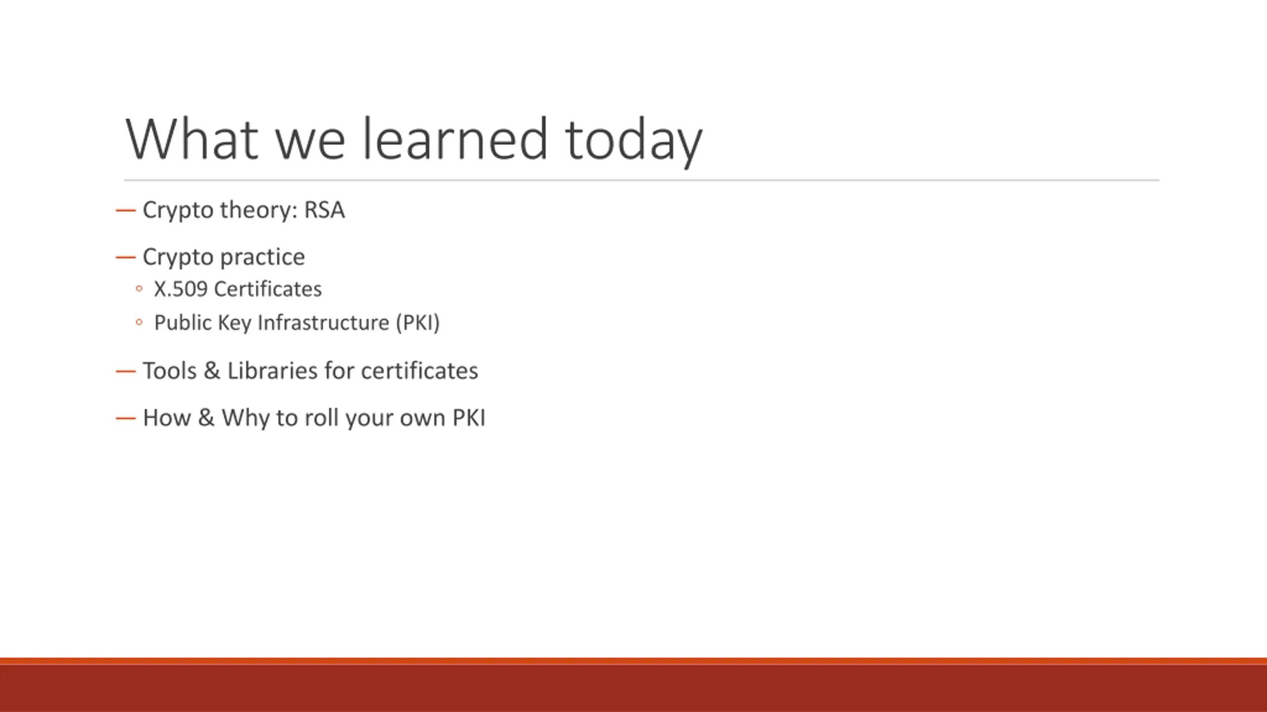 What we learned today Crypto theory: RSA Crypto practice X.509 Certificates Public Key Infrastructure (PKI) Tools & Libraries for certificates How & Why to roll your own PKI