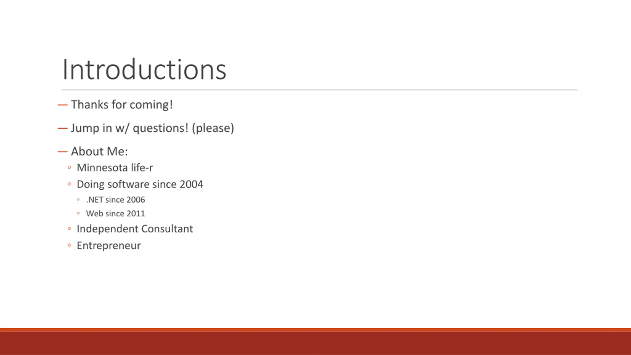 Introductions Thanks for coming! Jump in w/ questions! (please) About Me: Minnesota life-r Doing software since 2004 .NET since 2006 Web since 2011 Independent Consultant Entrepreneur