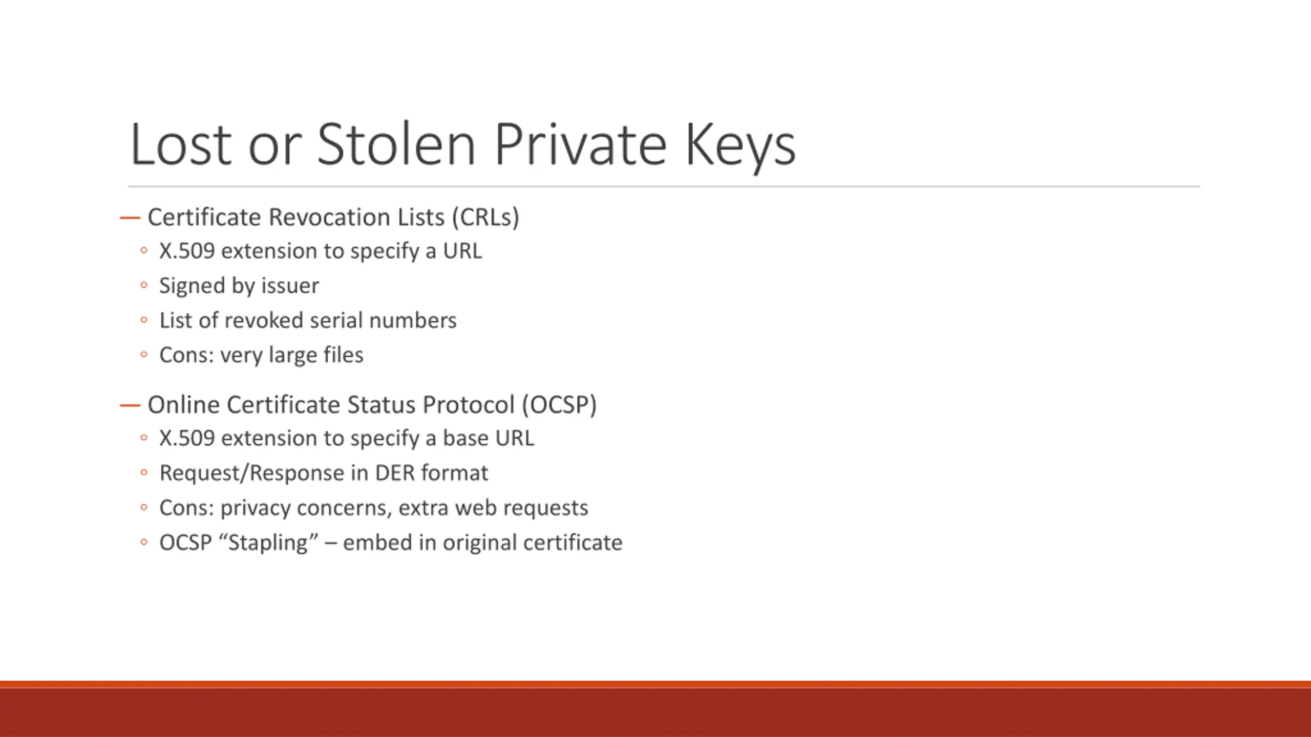 Lost or Stolen Private Keys Certificate Revocation Lists (CRLs) X.509 extension to specify a URL Signed by issuer List of revoked serial numbers Cons: very large files Online Certificate Status Protocol (OCSP) X.509 extension to specify a base URL Request/Response in DER format Cons: privacy concerns, extra web requests OCSP Stapling embed in original certificate