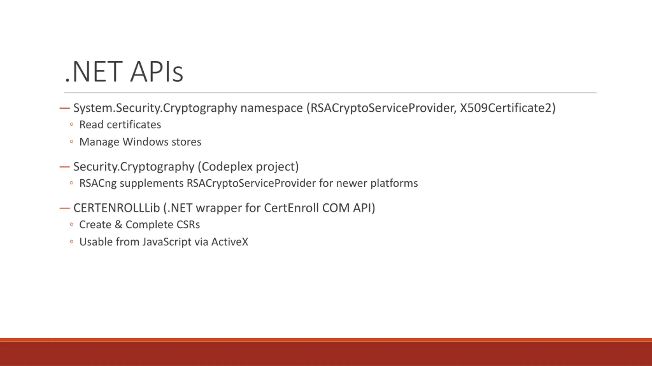 .NET APIs System.Security.Cryptography namespace (RSACryptoServiceProvider, X509Certificate2) Read certificates Manage Windows stores Security.Cryptography (Codeplex project) RSACng supplements RSACryptoServiceProvider for newer platforms CERTENROLLLib (.NET wrapper for CertEnroll COM API) Create & Complete CSRs Usable from JavaScript via ActiveX