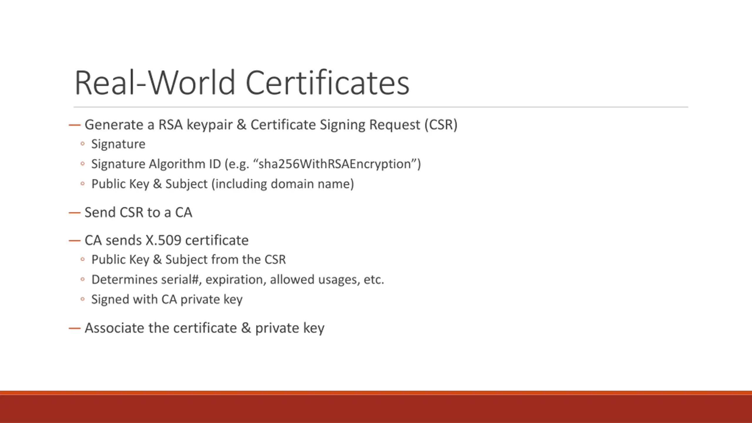 Real-World Certificates Generate a RSA keypair & Certificate Signing Request (CSR) Signature Signature Algorithm ID (e.g. sha256WithRSAEncryption ) Public Key & Subject (including domain name) Send CSR to a CA CA sends X.509 certificate Public Key & Subject from the CSR Determines serial#, expiration, allowed usages, etc. Signed with CA private key Associate the certificate & private key