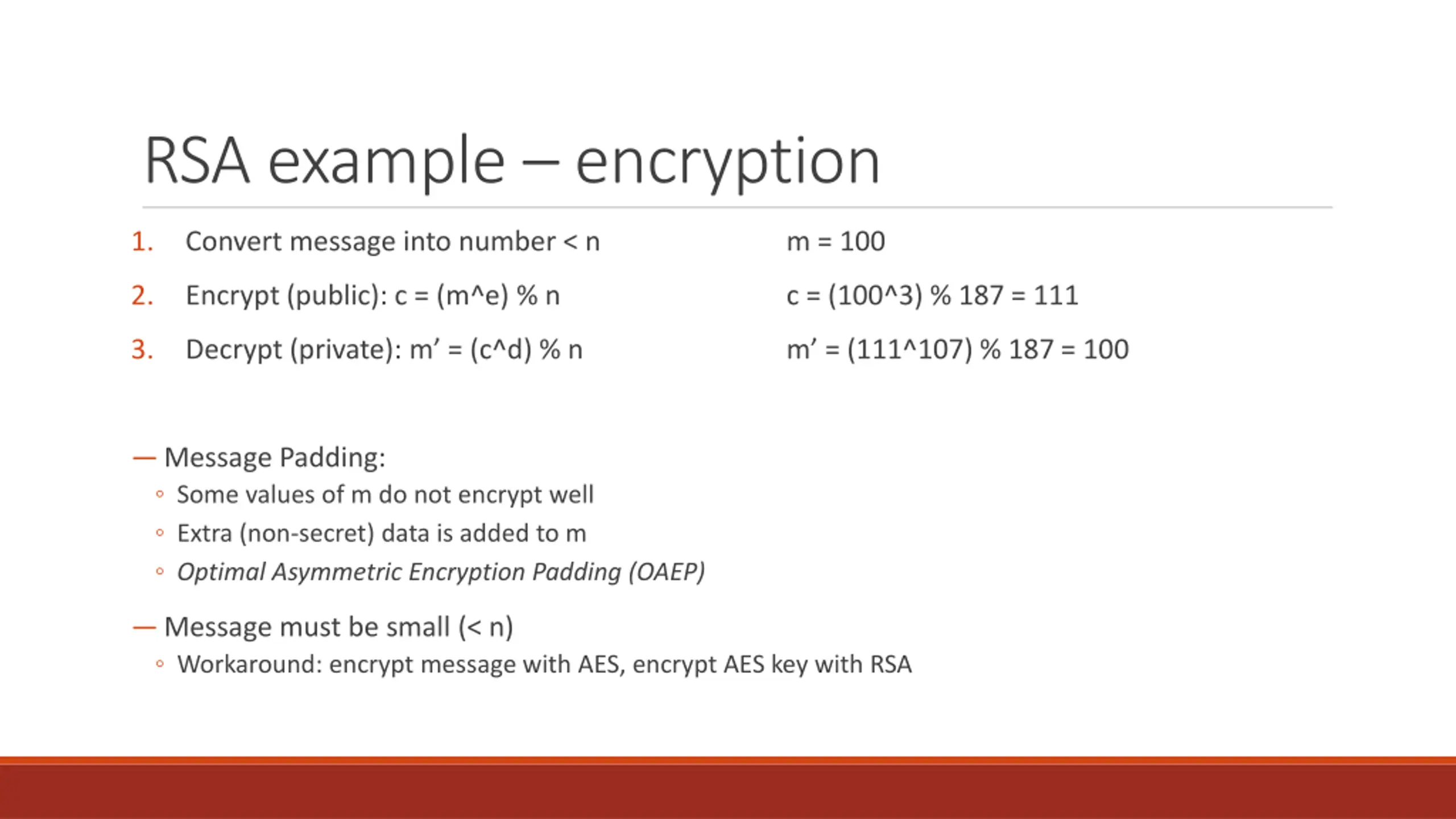 RSA example encryption 1. Convert message into number < n m = 100 2. Encrypt (public): c = (m^e) % n c = (100^3) % 187 = 111 3. Decrypt (private): m = (c^d) % n m = (111^107) % 187 = 100 Message Padding: Some values of m do not encrypt well Extra (non-secret) data is added to m Optimal Asymmetric Encryption Padding (OAEP) Message must be small (< n) Workaround: encrypt message with AES, encrypt AES key with RSA