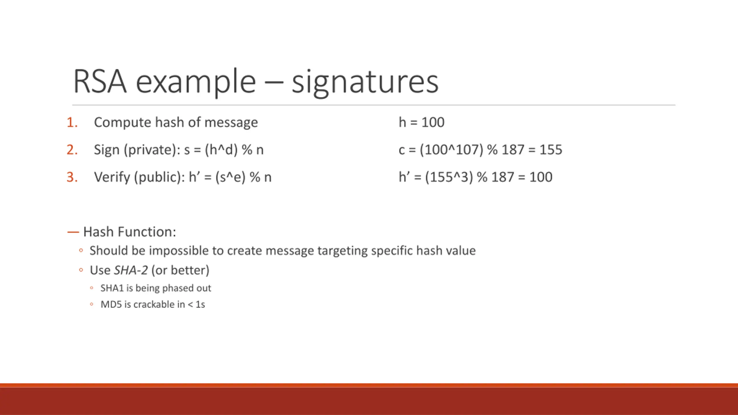 RSA example signatures 1. Compute hash of message h = 100 2. Sign (private): s = (h^d) % n c = (100^107) % 187 = 155 3. Verify (public): h = (s^e) % n h = (155^3) % 187 = 100 Hash Function: Should be impossible to create message targeting specific hash value Use SHA-2 (or better) SHA1 is being phased out MD5 is crackable in < 1s