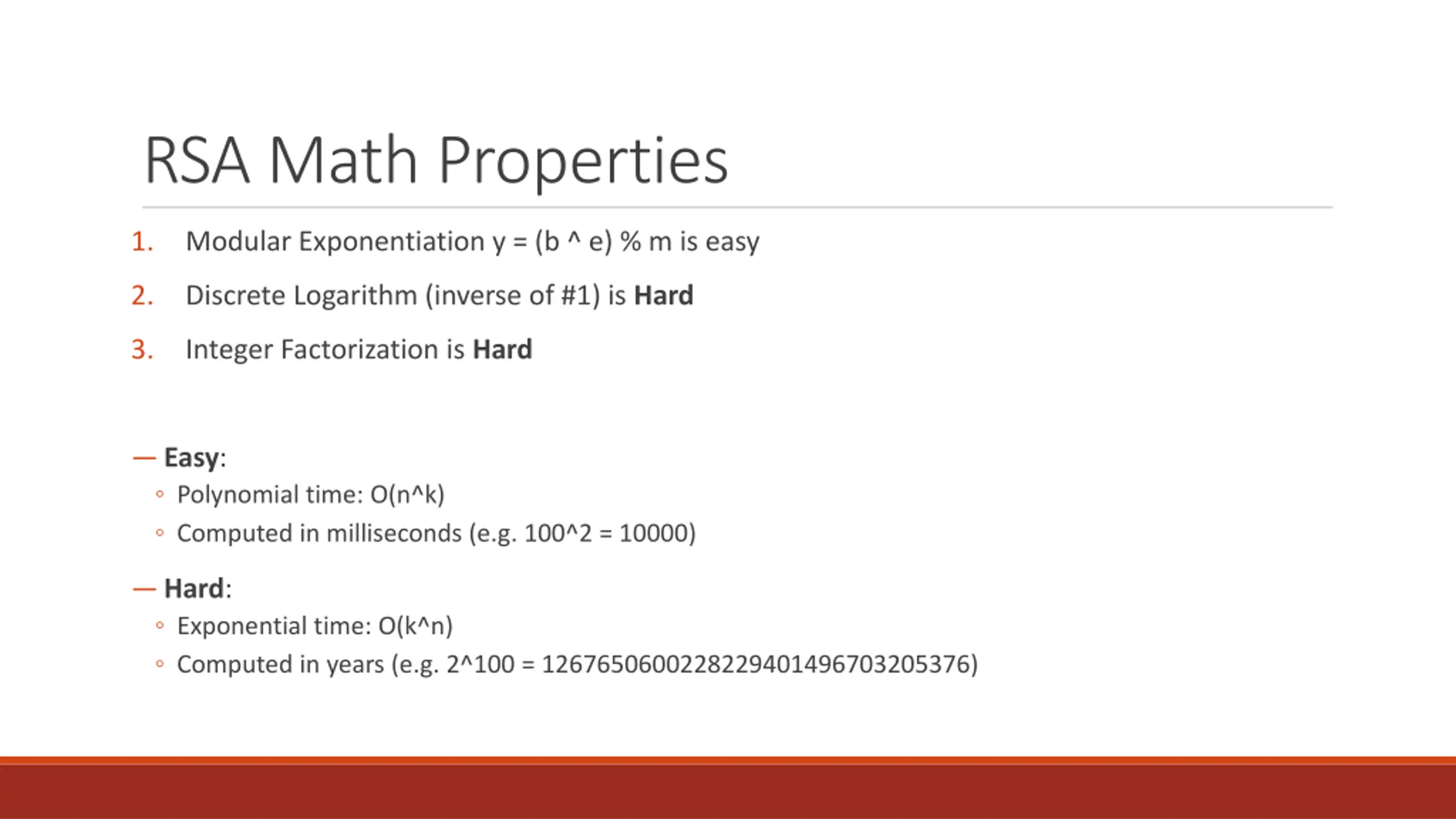 RSA Math Properties 1. Modular Exponentiation y = (b ^ e) % m is easy 2. Discrete Logarithm (inverse of #1) is Hard 3. Integer Factorization is Hard Easy: Polynomial time: O(n^k) Computed in milliseconds (e.g. 100^2 = 10000) Hard: Exponential time: O(k^n) Computed in years (e.g. 2^100 = 1267650600228229401496703205376)