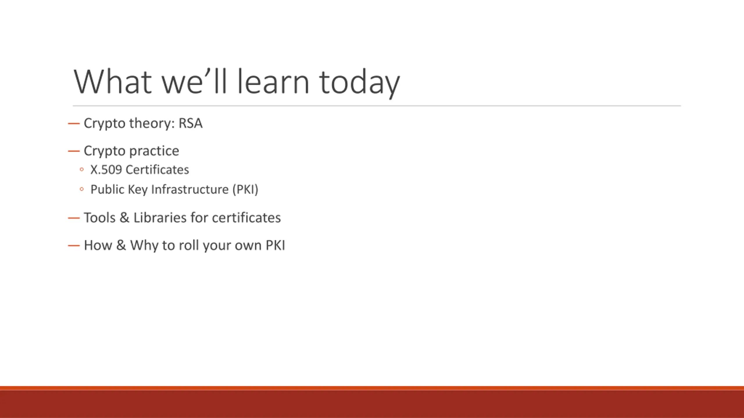 What well learn today Crypto theory: RSA Crypto practice X.509 Certificates Public Key Infrastructure (PKI) Tools & Libraries for certificates How & Why to roll your own PKI