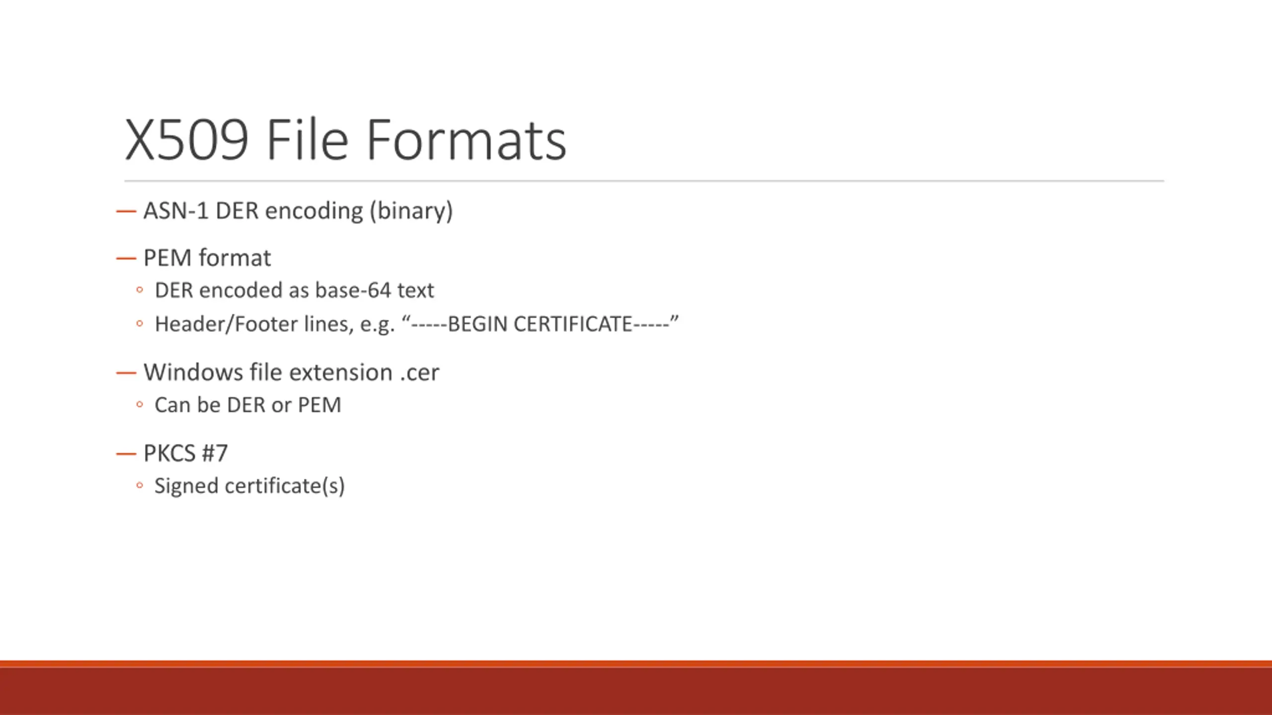X509 File Formats ASN-1 DER encoding (binary) PEM format DER encoded as base-64 text Header/Footer lines, e.g. -----BEGIN CERTIFICATE----- Windows file extension .cer Can be DER or PEM PKCS #7 Signed certificate(s)