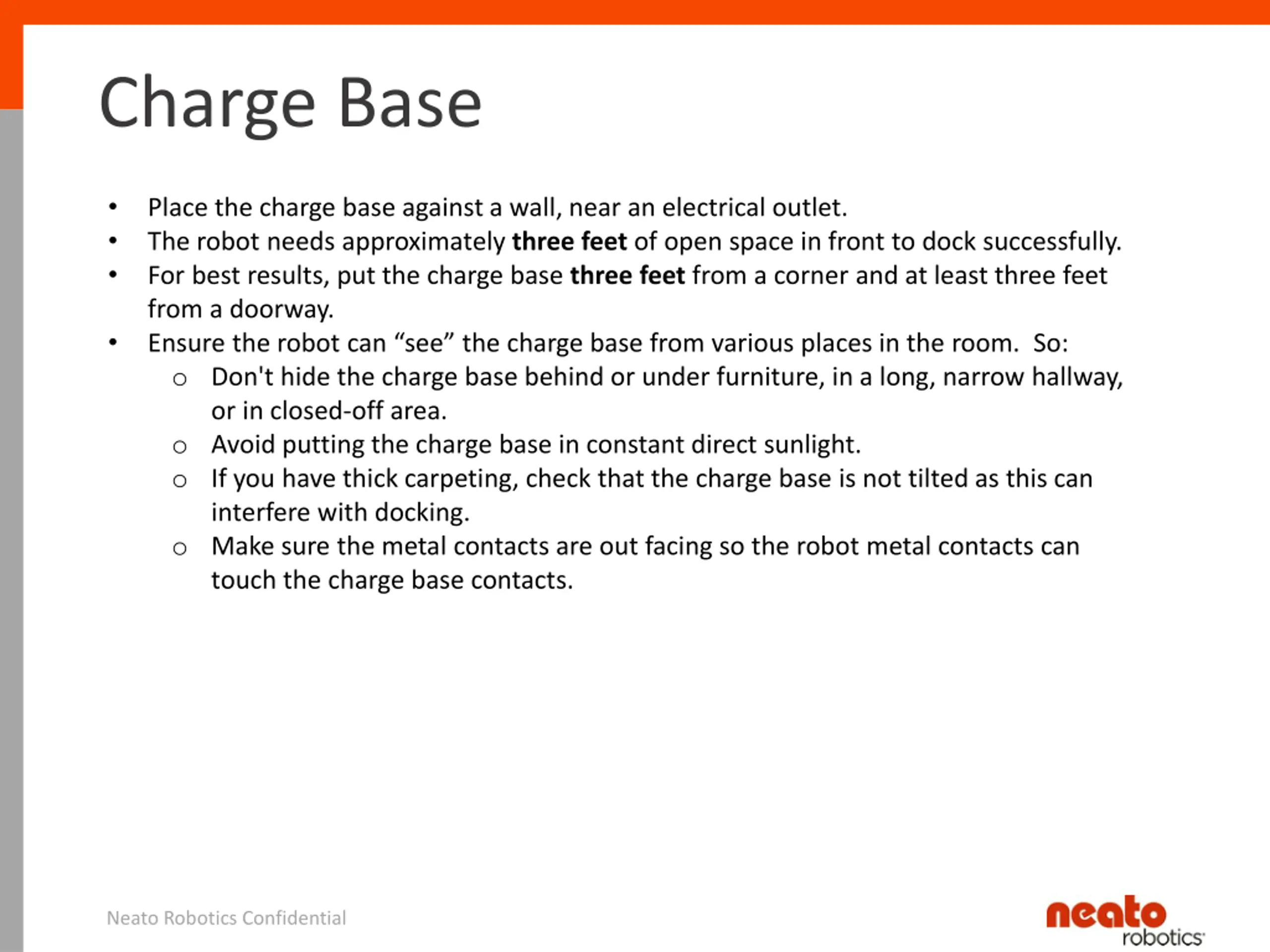 Charge Base Place the charge base against a wall, near an electrical outlet. The robot needs approximately three feet of open space in front to dock successfully. For best results, put the charge base three feet from a corner and at least three feet from a doorway. Ensure the robot can see the charge base from various places in the room. So: o Don't hide the charge base behind or under furniture, in a long, narrow hallway, or in closed-off area. o Avoid putting the charge base in constant direct sunlight. o If you have thick carpeting, check that the charge base is not tilted as this can interfere with docking. o Make sure the metal contacts are out facing so the robot metal contacts can touch the charge base contacts. Neato Robotics Confidential