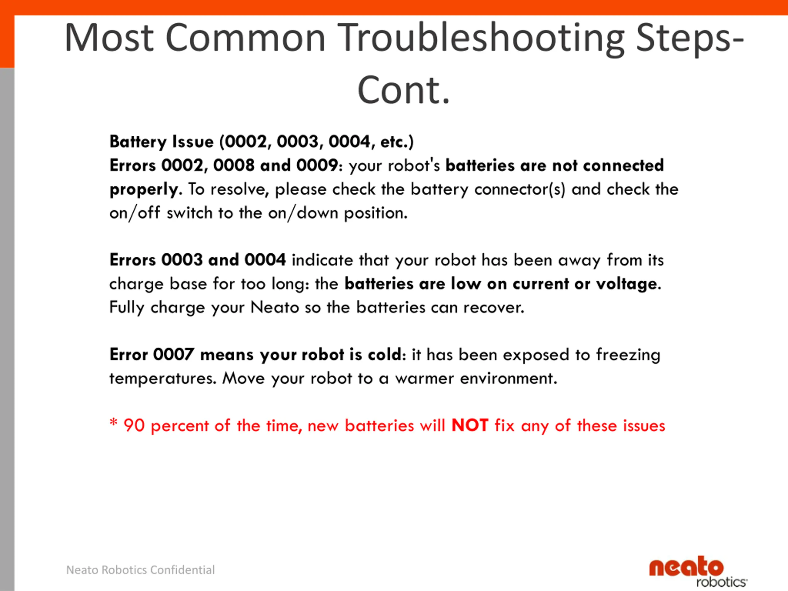 Most Common Troubleshooting Steps- Cont. Battery Issue (0002, 0003, 0004, etc.) Errors 0002, 0008 and 0009: your robot's batteries are not connected properly. To resolve, please check the battery connector(s) and check the on/off switch to the on/down position. Errors 0003 and 0004 indicate that your robot has been away from its charge base for too long: the batteries are low on current or voltage. Fully charge your Neato so the batteries can recover. Error 0007 means your robot is cold: it has been exposed to freezing temperatures. Move your robot to a warmer environment. * 90 percent of the time, new batteries will NOT fix any of these issues Neato Robotics Confidential