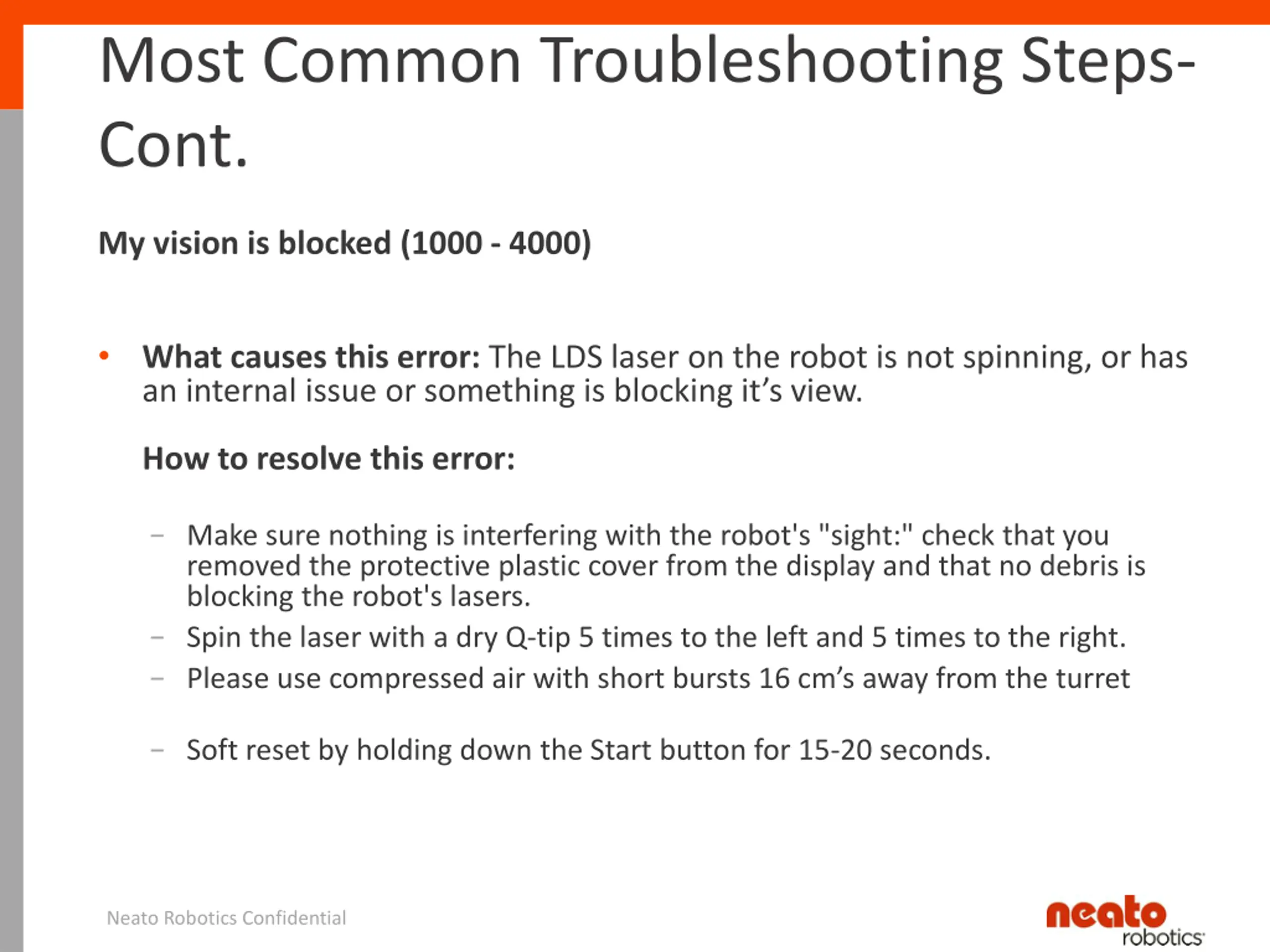 Most Common Troubleshooting Steps- Cont. My vision is blocked (1000 - 4000) What causes this error: The LDS laser on the robot is not spinning, or has an internal issue or something is blocking it s view. How to resolve this error: - Make sure nothing is interfering with the robot's "sight:" check that you removed the protective plastic cover from the display and that no debris is blocking the robot's lasers. - Spin the laser with a dry Q-tip 5 times to the left and 5 times to the right. - Please use compressed air with short bursts 16 cm s away from the turret - Soft reset by holding down the Start button for 15-20 seconds. Neato Robotics Confidential