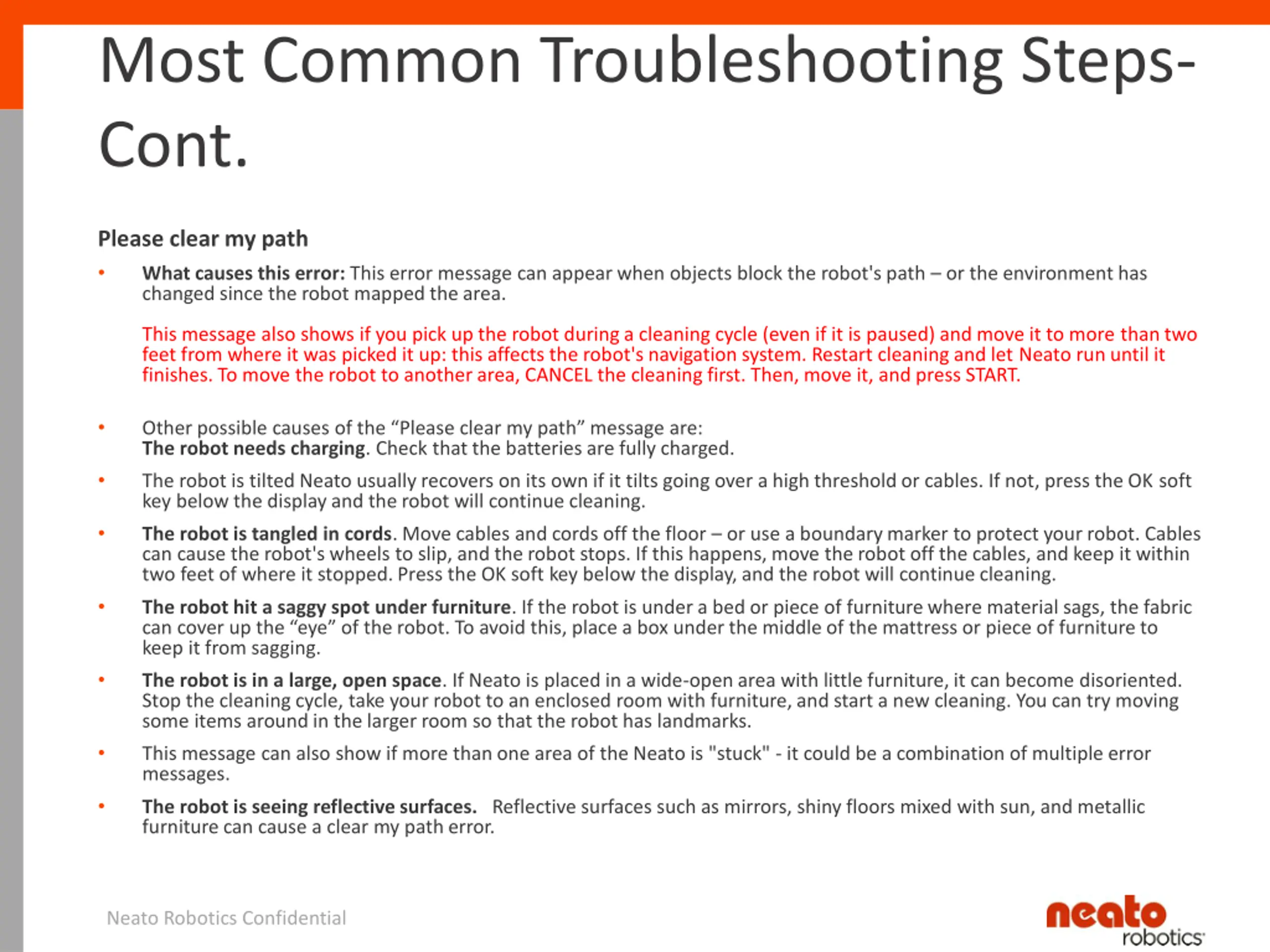 Most Common Troubleshooting Steps- Cont. Please clear my path What causes this error: This error message can appear when objects block the robot's path or the environment has changed since the robot mapped the area. This message also shows if you pick up the robot during a cleaning cycle (even if it is paused) and move it to more than two feet from where it was picked it up: this affects the robot's navigation system. Restart cleaning and let Neato run until it finishes. To move the robot to another area, CANCEL the cleaning first. Then, move it, and press START. Other possible causes of the Please clear my path message are: The robot needs charging. Check that the batteries are fully charged. The robot is tilted Neato usually recovers on its own if it tilts going over a high threshold or cables. If not, press the OK soft key below the display and the robot will continue cleaning. The robot is tangled in cords. Move cables and cords off the floor or use a boundary marker to protect your robot. Cables can cause the robot's wheels to slip, and the robot stops. If this happens, move the robot off the cables, and keep it within two feet of where it stopped. Press the OK soft key below the display, and the robot will continue cleaning. The robot hit a saggy spot under furniture. If the robot is under a bed or piece of furniture where material sags, the fabric can cover up the eye of the robot. To avoid this, place a box under the middle of the mattress or piece of furniture to keep it from sagging. The robot is in a large, open space. If Neato is placed in a wide-open area with little furniture, it can become disoriented. Stop the cleaning cycle, take your robot to an enclosed room with furniture, and start a new cleaning. You can try moving some items around in the larger room so that the robot has landmarks. This message can also show if more than one area of the Neato is "stuck" - it could be a combination of multiple error messages. The robot is seeing reflective surfaces. Reflective surfaces such as mirrors, shiny floors mixed with sun, and metallic furniture can cause a clear my path error. Neato Robotics Confidential