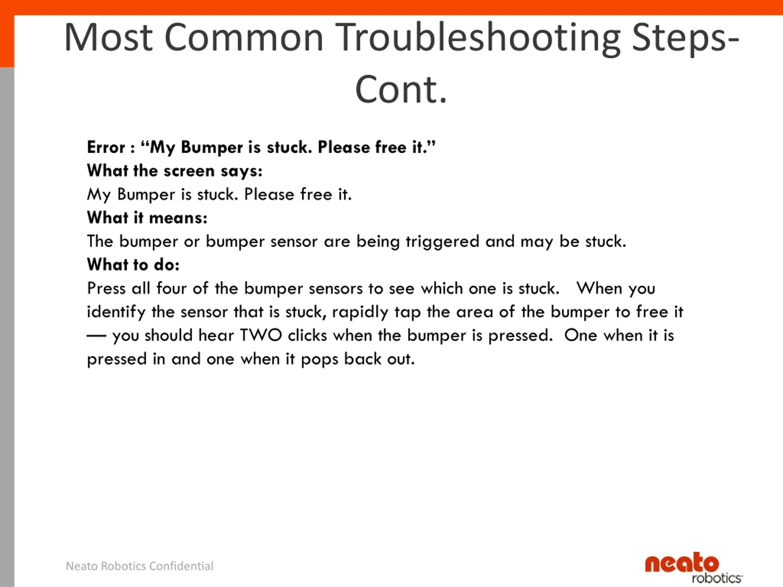 Most Common Troubleshooting Steps- Cont. Error : My Bumper is stuck. Please free it. What the screen says: My Bumper is stuck. Please free it. What it means: The bumper or bumper sensor are being triggered and may be stuck. What to do: Press all four of the bumper sensors to see which one is stuck. When you identify the sensor that is stuck, rapidly tap the area of the bumper to free it you should hear TWO clicks when the bumper is pressed. One when it is pressed in and one when it pops back out. Neato Robotics Confidential