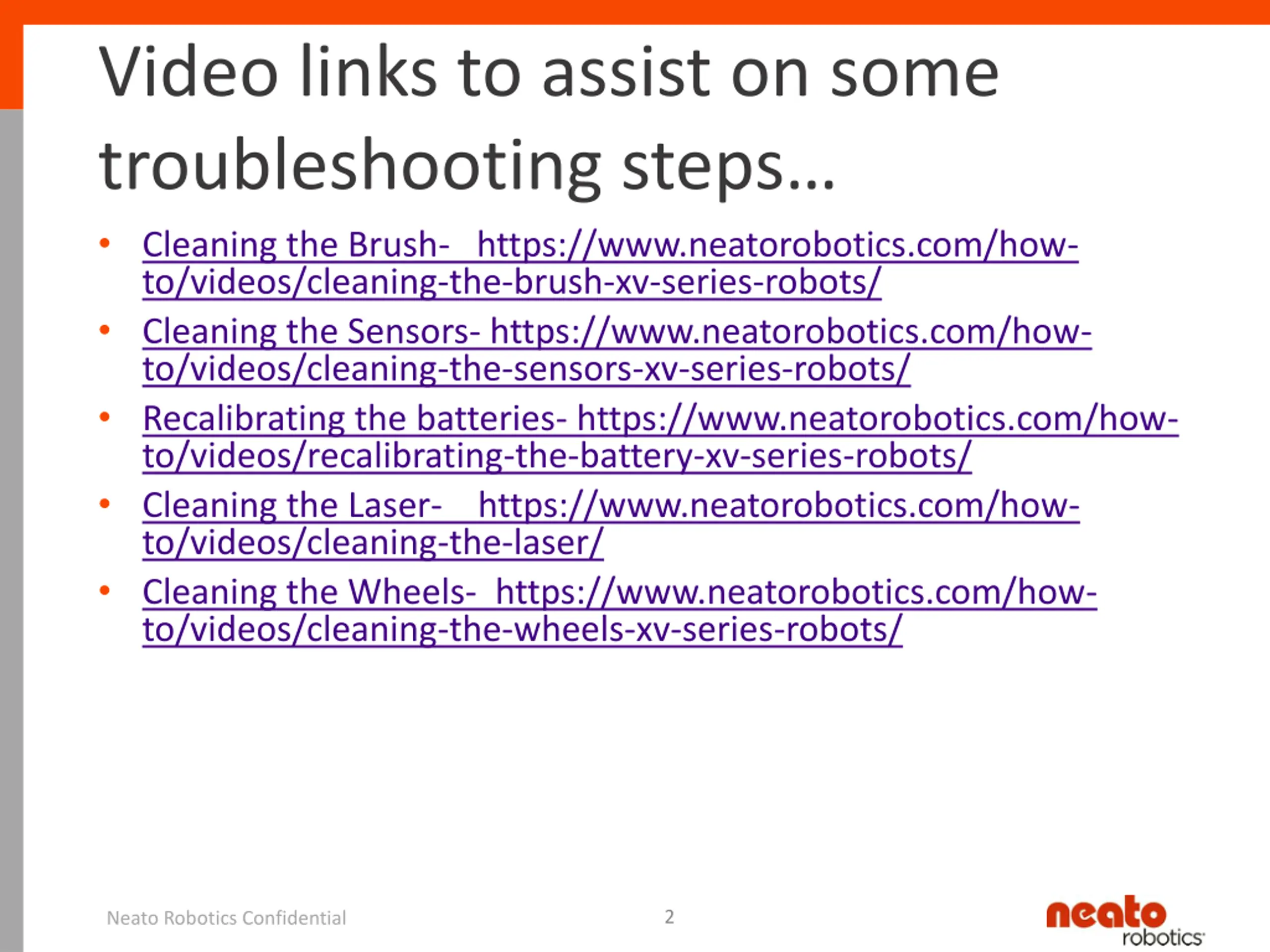 Video links to assist on some troubleshooting steps Cleaning the Brush- https://www.neatorobotics.com/how- to/videos/cleaning-the-brush-xv-series-robots/ Cleaning the Sensors- https://www.neatorobotics.com/how- to/videos/cleaning-the-sensors-xv-series-robots/ Recalibrating the batteries- https://www.neatorobotics.com/how- to/videos/recalibrating-the-battery-xv-series-robots/ Cleaning the Laser- https://www.neatorobotics.com/how- to/videos/cleaning-the-laser/ Cleaning the Wheels- https://www.neatorobotics.com/how- to/videos/cleaning-the-wheels-xv-series-robots/ 2 Neato Robotics Confidential