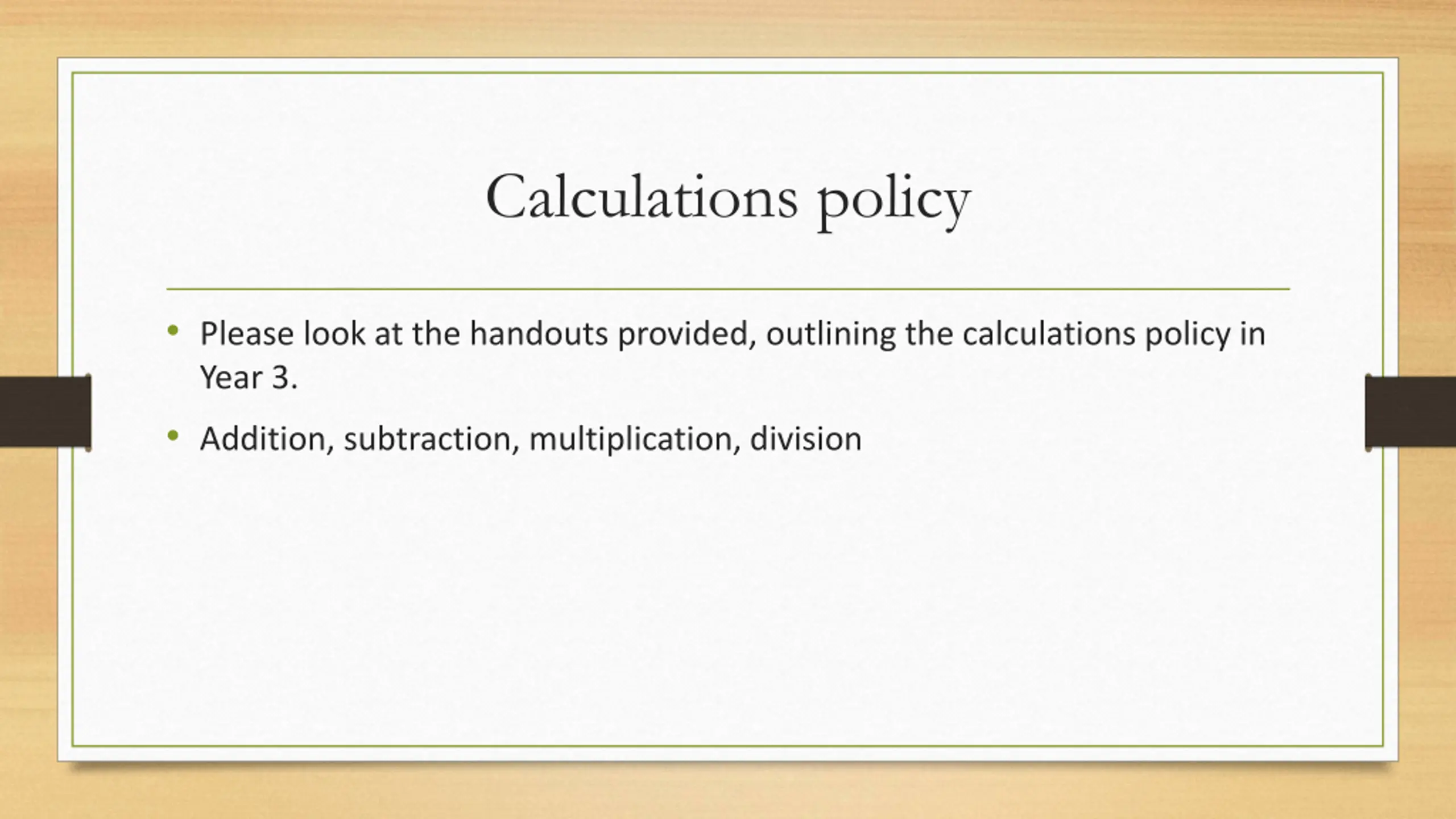 Calculations policy Please look at the handouts provided, outlining the calculations policy in Year 3. Addition, subtraction, multiplication, division