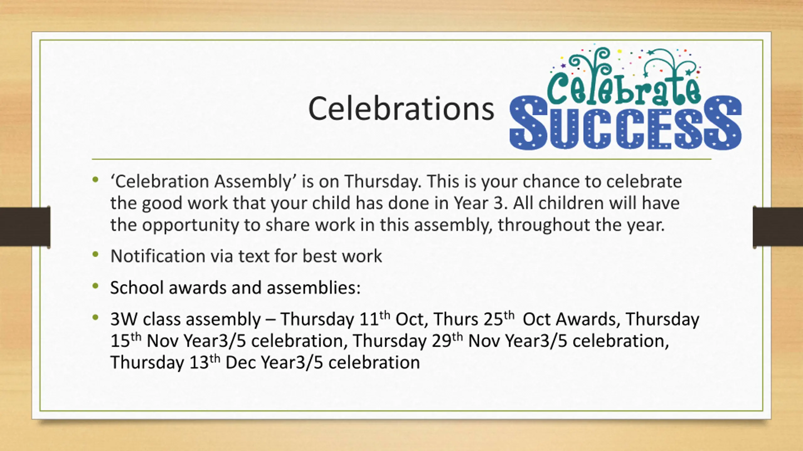 Celebrations Celebration Assembly is on Thursday. This is your chance to celebrate the good work that your child has done in Year 3. All children will have the opportunity to share work in this assembly, throughout the year. Notification via text for best work School awards and assemblies: 3W class assembly Thursday 11thOct, Thurs 25th Oct Awards, Thursday 15thNov Year3/5 celebration, Thursday 29thNov Year3/5 celebration, Thursday 13thDec Year3/5 celebration