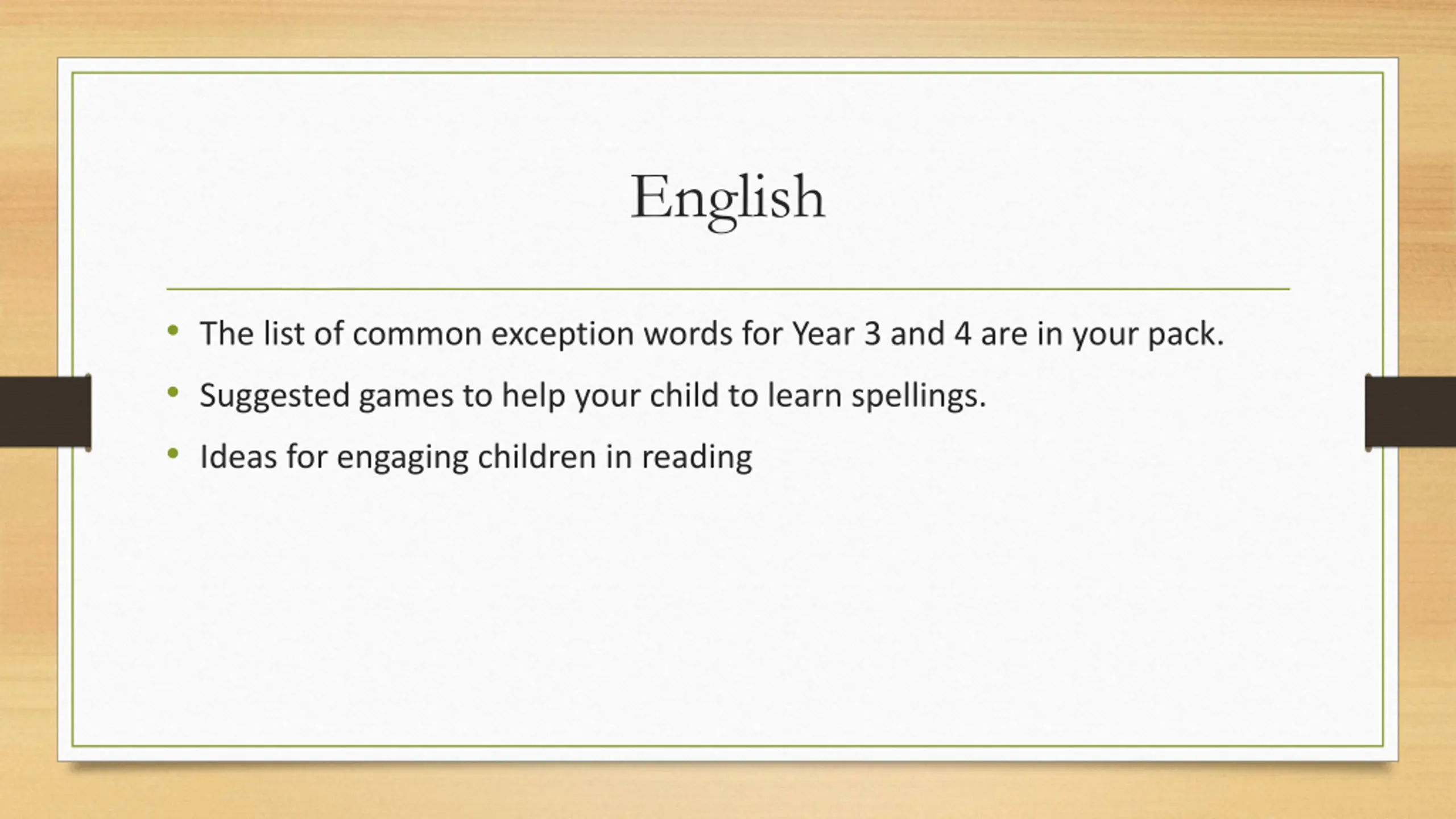 English The list of common exception words for Year 3 and 4 are in your pack. Suggested games to help your child to learn spellings. Ideas for engaging children in reading