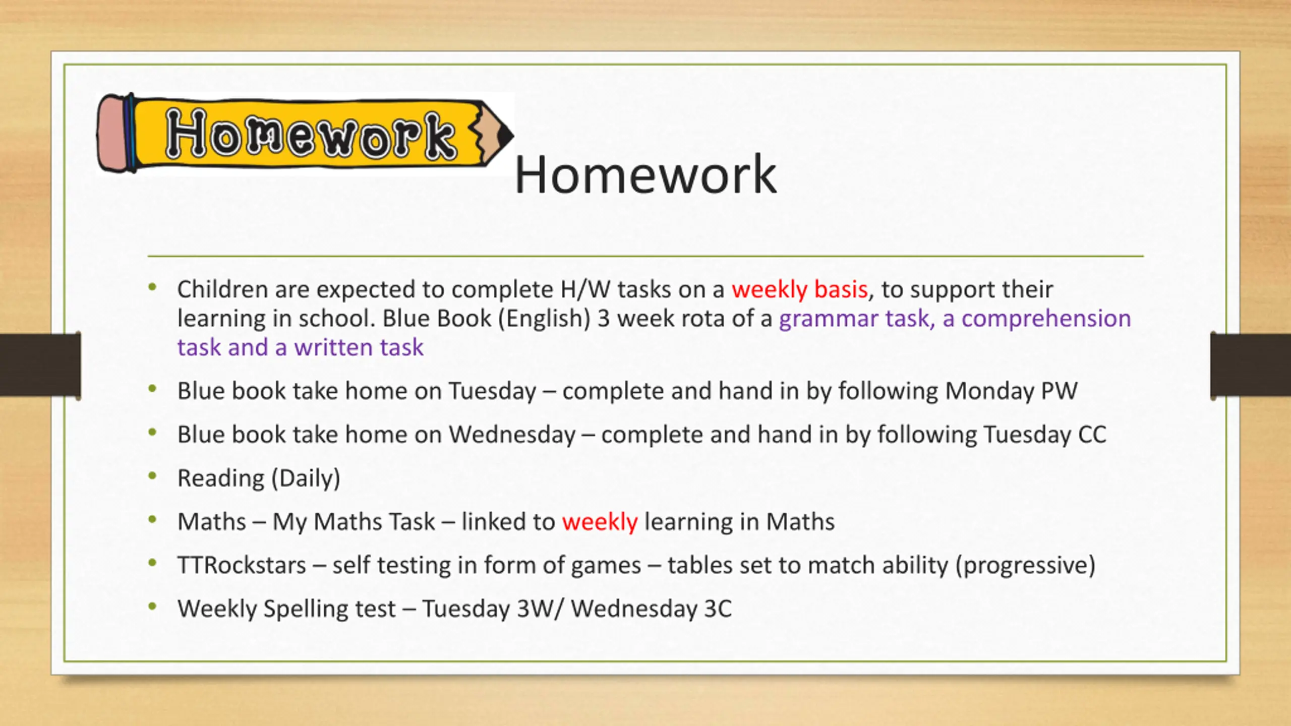 Homework Children are expected to complete H/W tasks on a weekly basis, to support their learning in school. Blue Book (English) 3 week rota of a grammar task, a comprehension task and a written task Blue book take home on Tuesday complete and hand in by following Monday PW Blue book take home on Wednesday complete and hand in by following Tuesday CC Reading (Daily) Maths My Maths Task linked to weekly learning in Maths TTRockstars self testing in form of games tables set to match ability (progressive) Weekly Spelling test Tuesday 3W/ Wednesday 3C