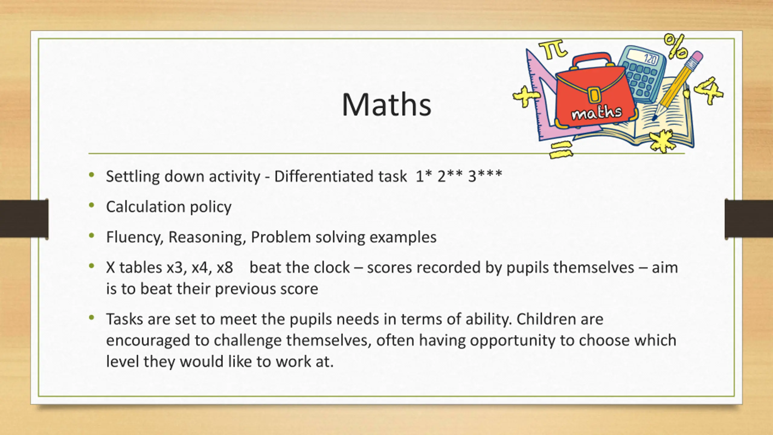 Maths Settling down activity - Differentiated task 1* 2** 3*** Calculation policy Fluency, Reasoning, Problem solving examples X tables x3, x4, x8 beat the clock scores recorded by pupils themselves aim is to beat their previous score Tasks are set to meet the pupils needs in terms of ability. Children are encouraged to challenge themselves, often having opportunity to choose which level they would like to work at.
