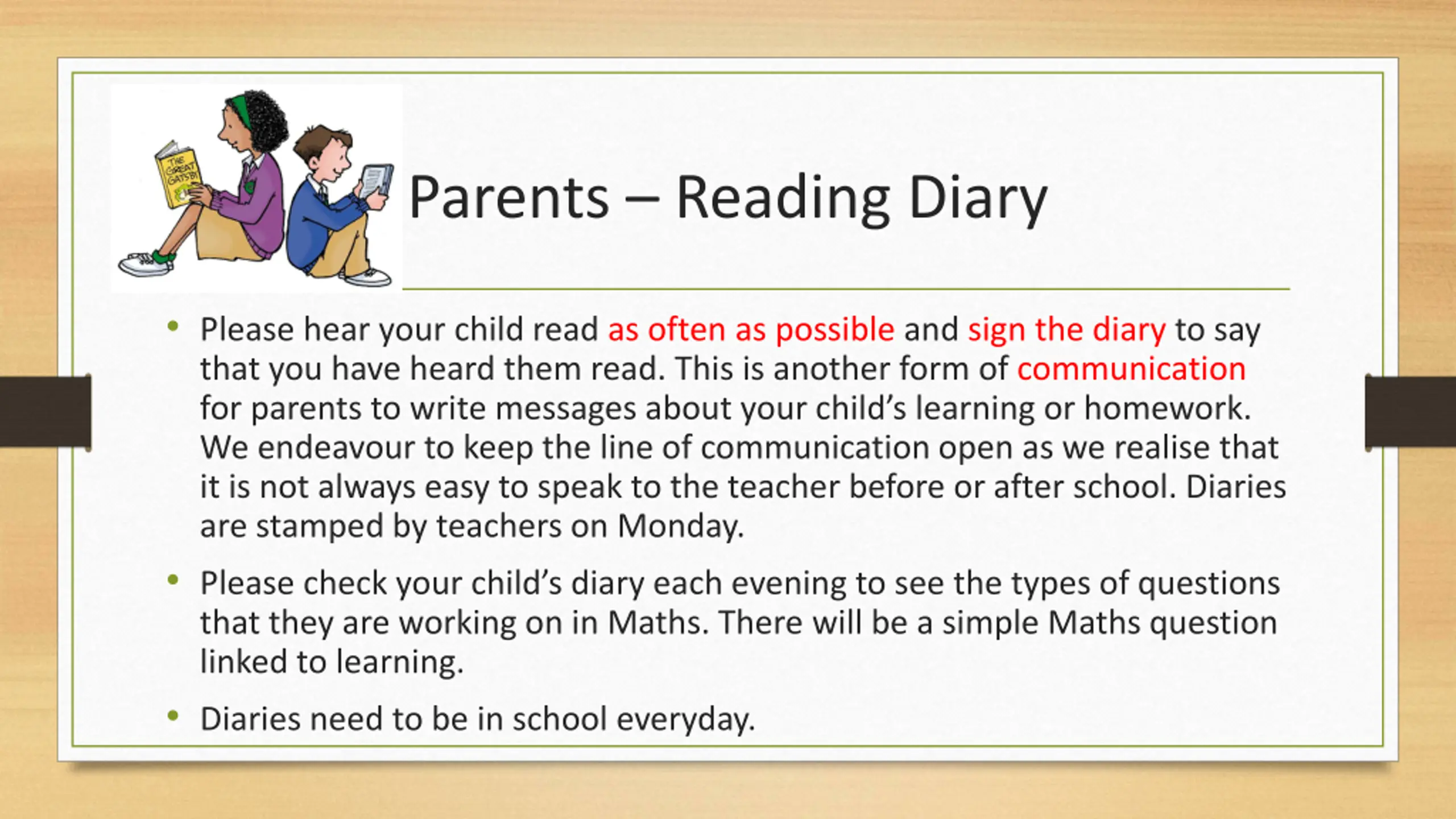 Parents Reading Diary Please hear your child read as often as possible and sign the diary to say that you have heard them read. This is another form of communication for parents to write messages about your child s learning or homework. We endeavour to keep the line of communication open as we realise that it is not always easy to speak to the teacher before or after school. Diaries are stamped by teachers on Monday. Please check your child s diary each evening to see the types of questions that they are working on in Maths. There will be a simple Maths question linked to learning. Diaries need to be in school everyday.