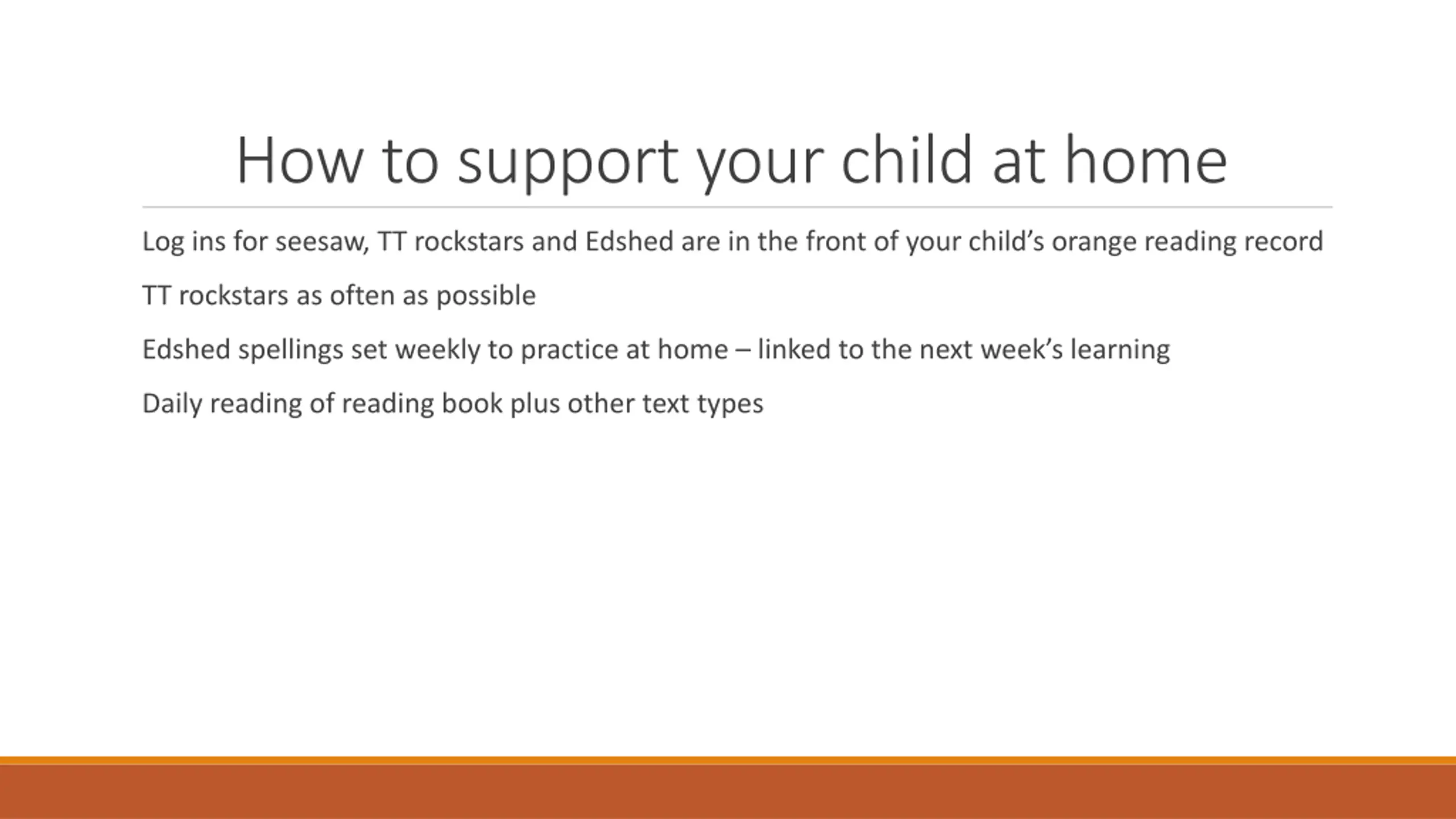 How to support your child at home Log ins for seesaw, TT rockstars and Edshed are in the front of your child s orange reading record TT rockstars as often as possible Edshed spellings set weekly to practice at home linked to the next week s learning Daily reading of reading book plus other text types