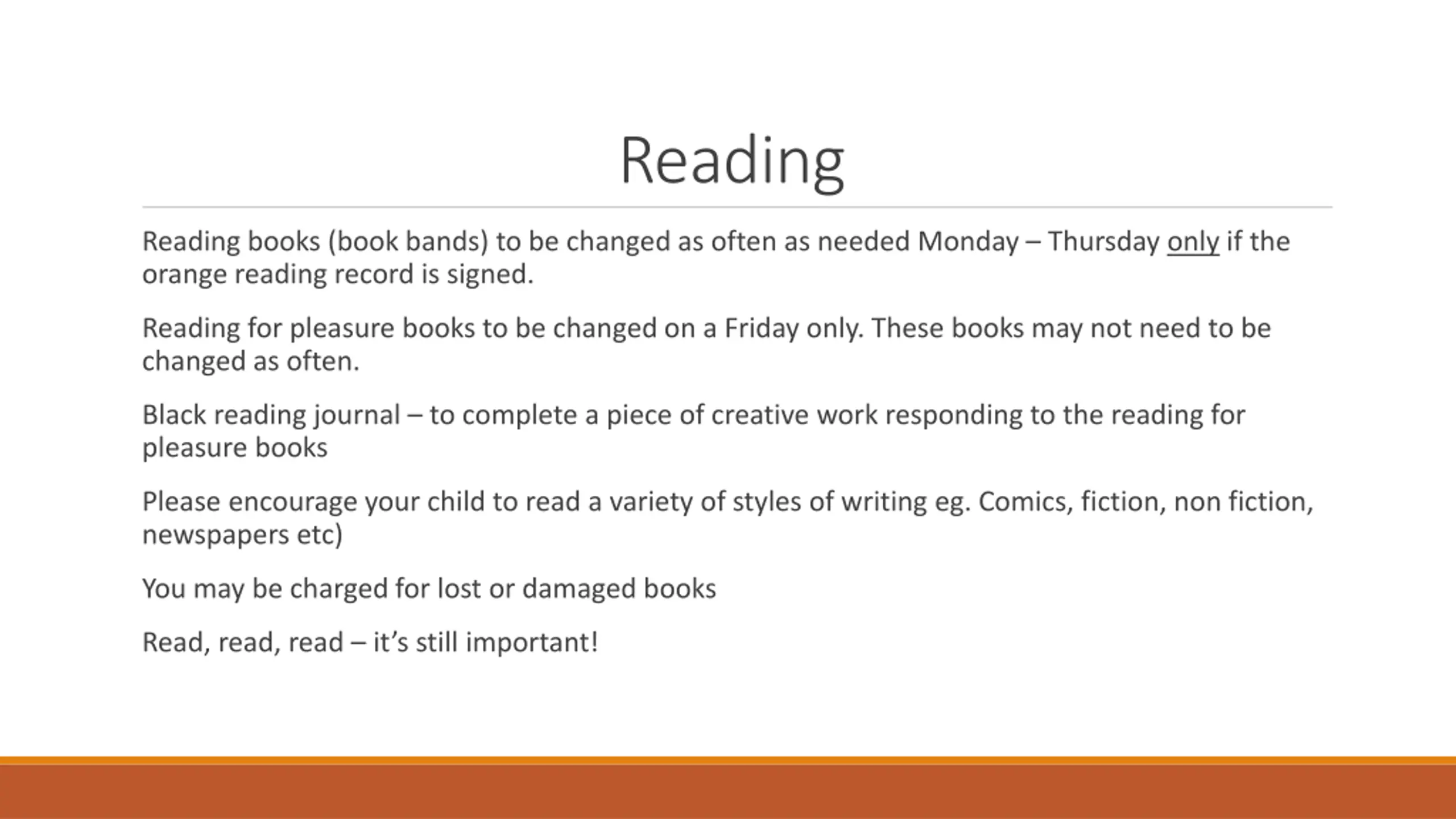 Reading Reading books (book bands) to be changed as often as needed Monday Thursday only if the orange reading record is signed. Reading for pleasure books to be changed on a Friday only. These books may not need to be changed as often. Black reading journal to complete a piece of creative work responding to the reading for pleasure books Please encourage your child to read a variety of styles of writing eg. Comics, fiction, non fiction, newspapers etc) You may be charged for lost or damaged books Read, read, read it s still important!