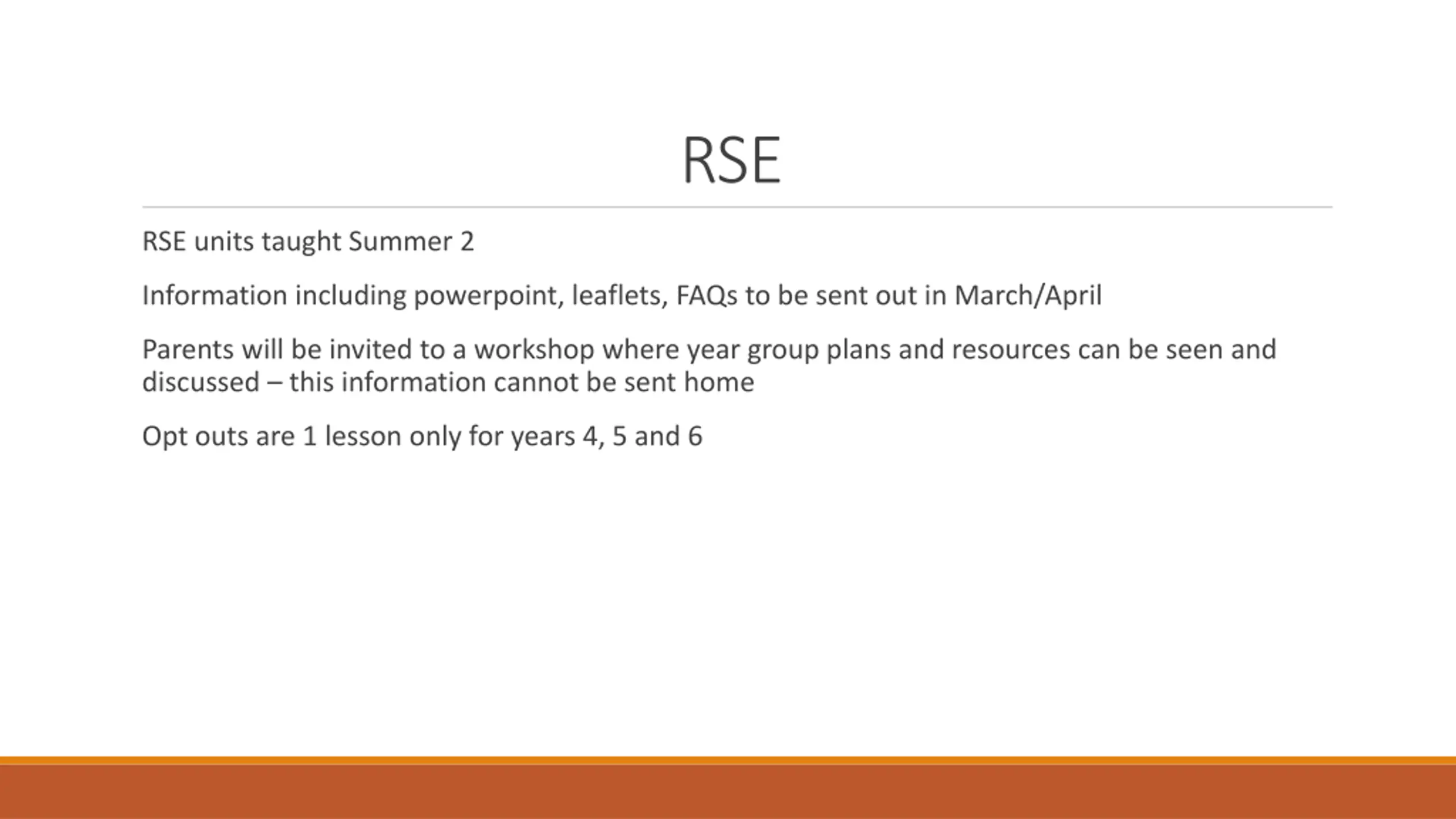 RSE RSE units taught Summer 2 Information including powerpoint, leaflets, FAQs to be sent out in March/April Parents will be invited to a workshop where year group plans and resources can be seen and discussed this information cannot be sent home Opt outs are 1 lesson only for years 4, 5 and 6