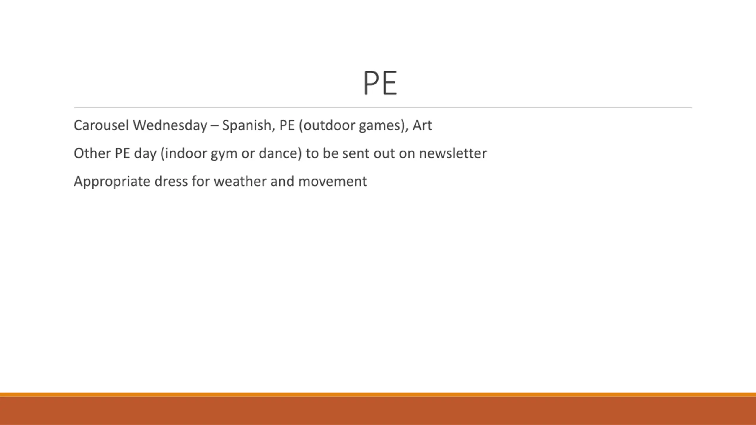 PE Carousel Wednesday Spanish, PE (outdoor games), Art Other PE day (indoor gym or dance) to be sent out on newsletter Appropriate dress for weather and movement
