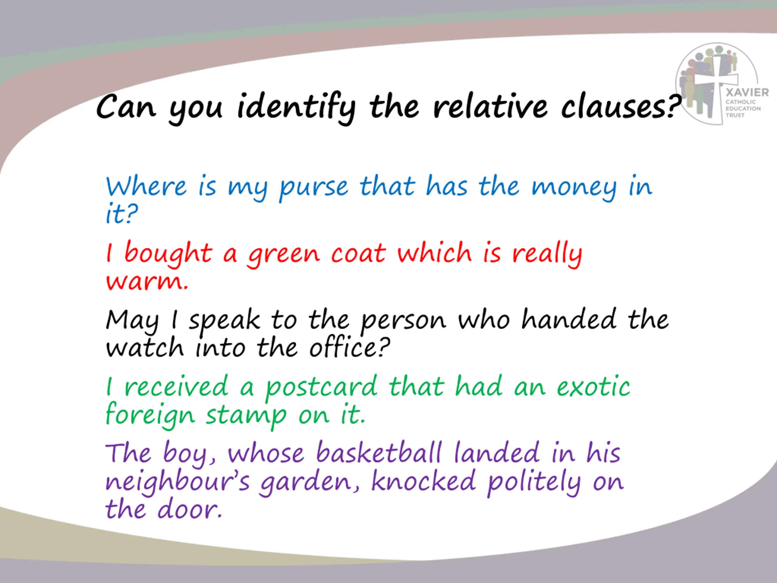 Can you identify the relative clauses? Where is my purse that has the money in it? I bought a green coat which is really warm. May I speak to the person who handed the watch into the office? I received a postcard that had an exotic foreign stamp on it. The boy, whose basketball landed in his neighbour s garden, knocked politely on the door.