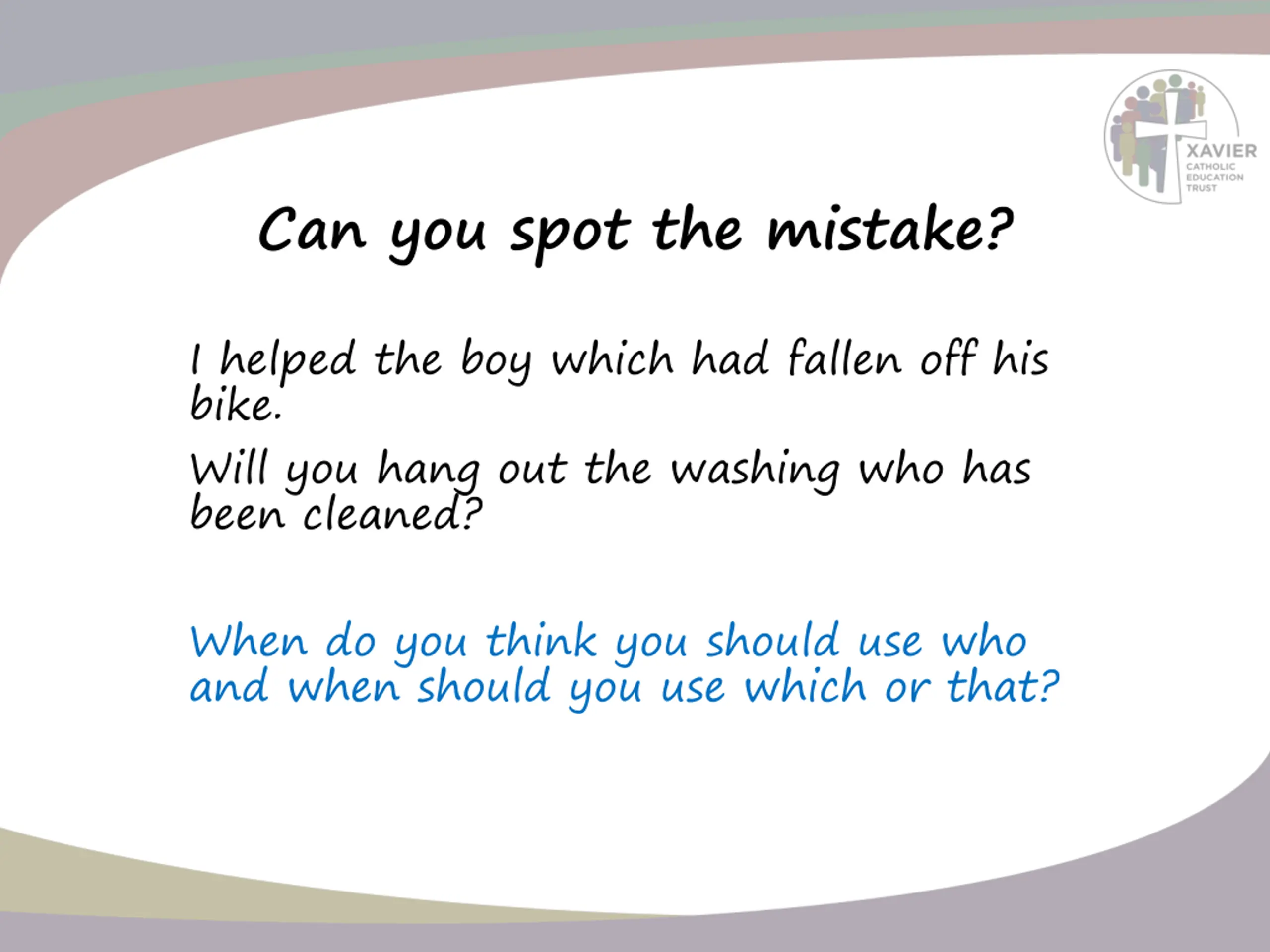 Can you spot the mistake? I helped the boy which had fallen off his bike. Will you hang out the washing who has been cleaned? When do you think you should use who and when should you use which or that?
