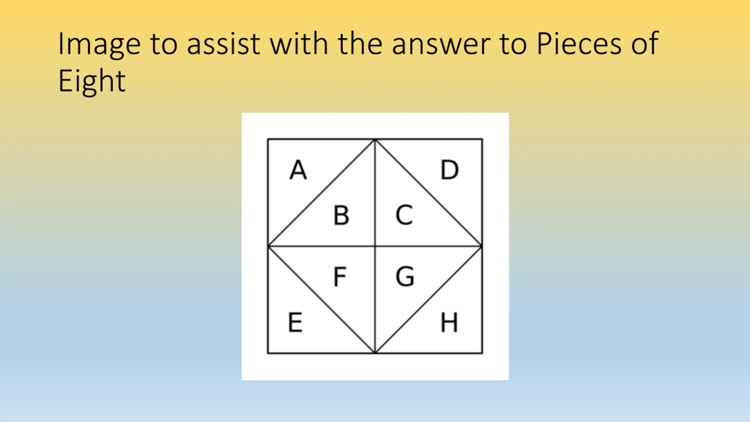 Year 9 & 10 High Achievers Year 9 & 10 High Achievers Pieces of Eight A square is divided into eight congruent triangles, as shown. Two of these triangles are selected at random and shaded black. What is the probability that the resulting figure has at least one axis of symmetry?