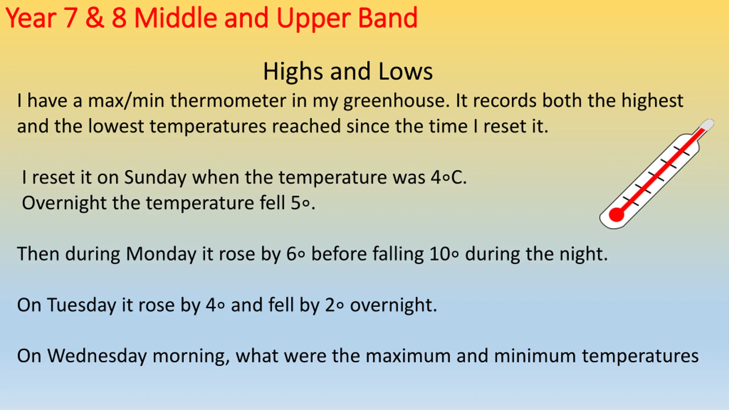 Year 7 & 8 Middle and Upper Band Year 7 & 8 Middle and Upper Band Highs and Lows I have a max/min thermometer in my greenhouse. It records both the highest and the lowest temperatures reached since the time I reset it. I reset it on Sunday when the temperature was 4 C. Overnight the temperature fell 5 . Then during Monday it rose by 6 before falling 10 during the night. On Tuesday it rose by 4 and fell by 2 overnight. On Wednesday morning, what were the maximum and minimum temperatures