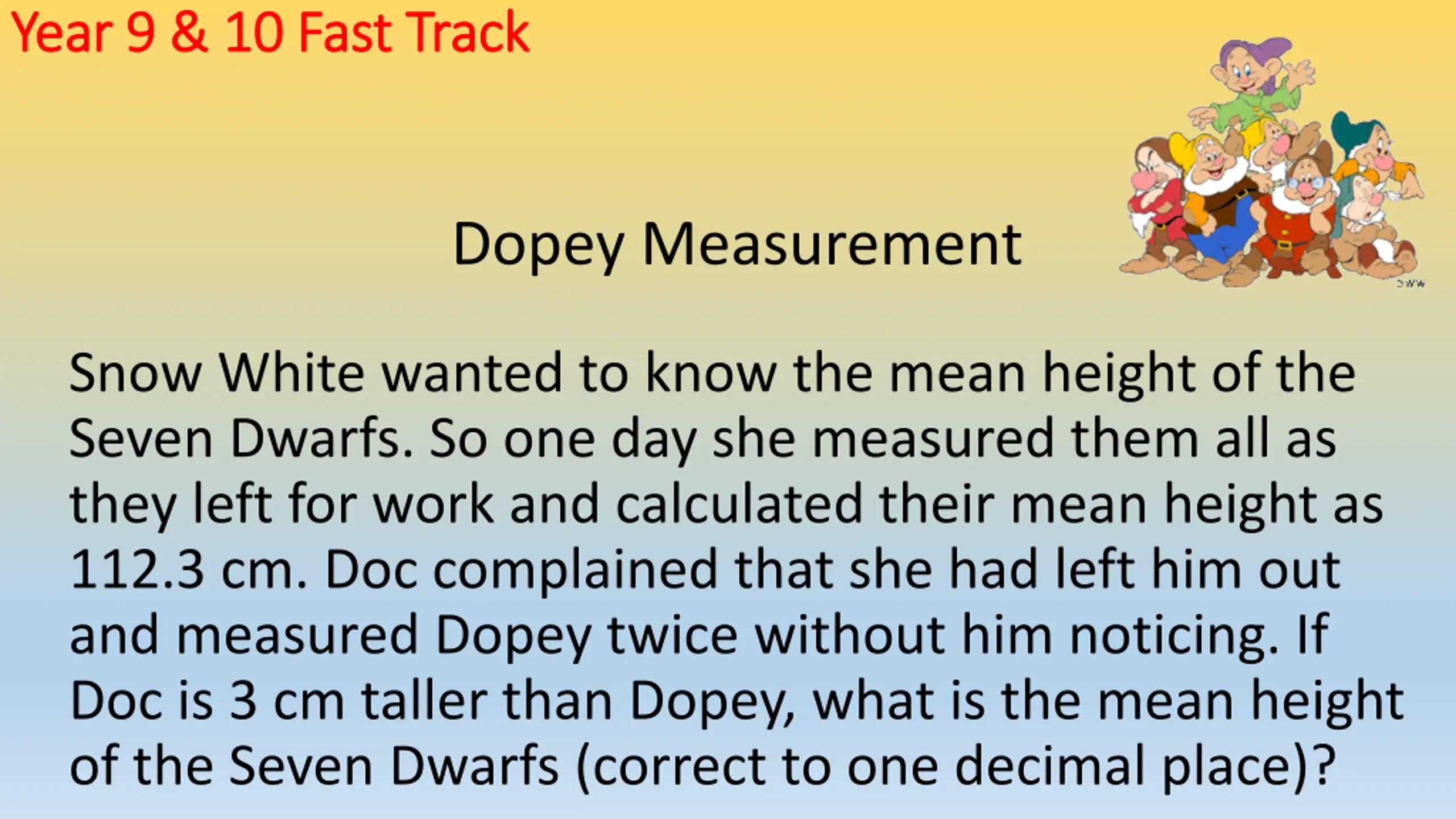 Year 9 & 10 Fast Track Year 9 & 10 Fast Track Dopey Measurement Snow White wanted to know the mean height of the Seven Dwarfs. So one day she measured them all as they left for work and calculated their mean height as 112.3 cm. Doc complained that she had left him out and measured Dopey twice without him noticing. If Doc is 3 cm taller than Dopey, what is the mean height of the Seven Dwarfs (correct to one decimal place)?