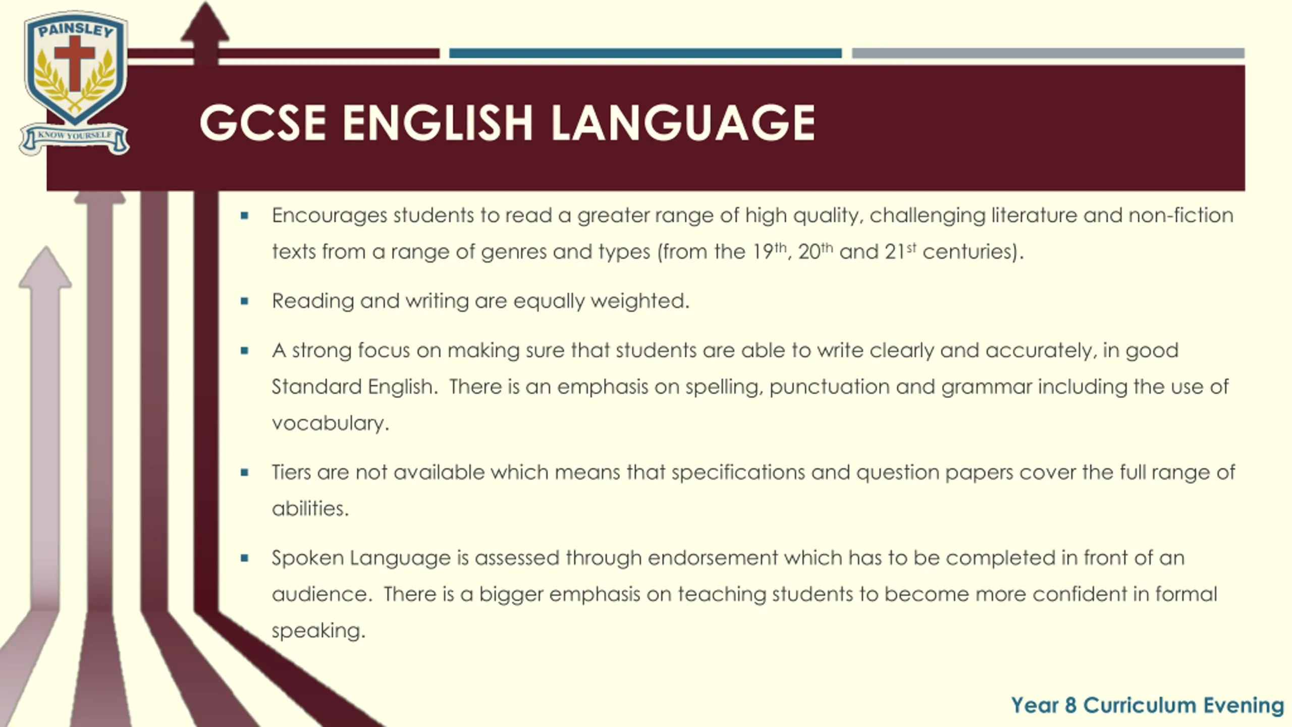 GCSE ENGLISH LANGUAGE Encourages students to read a greater range of high quality, challenging literature and non-fiction texts from a range of genres and types (from the 19th, 20th and 21st centuries). Reading and writing are equally weighted. A strong focus on making sure that students are able to write clearly and accurately, in good Standard English. There is an emphasis on spelling, punctuation and grammar including the use of vocabulary. Tiers are not available which means that specifications and question papers cover the full range of abilities. Spoken Language is assessed through endorsement which has to be completed in front of an audience. There is a bigger emphasis on teaching students to become more confident in formal speaking. Year 8 Curriculum Evening