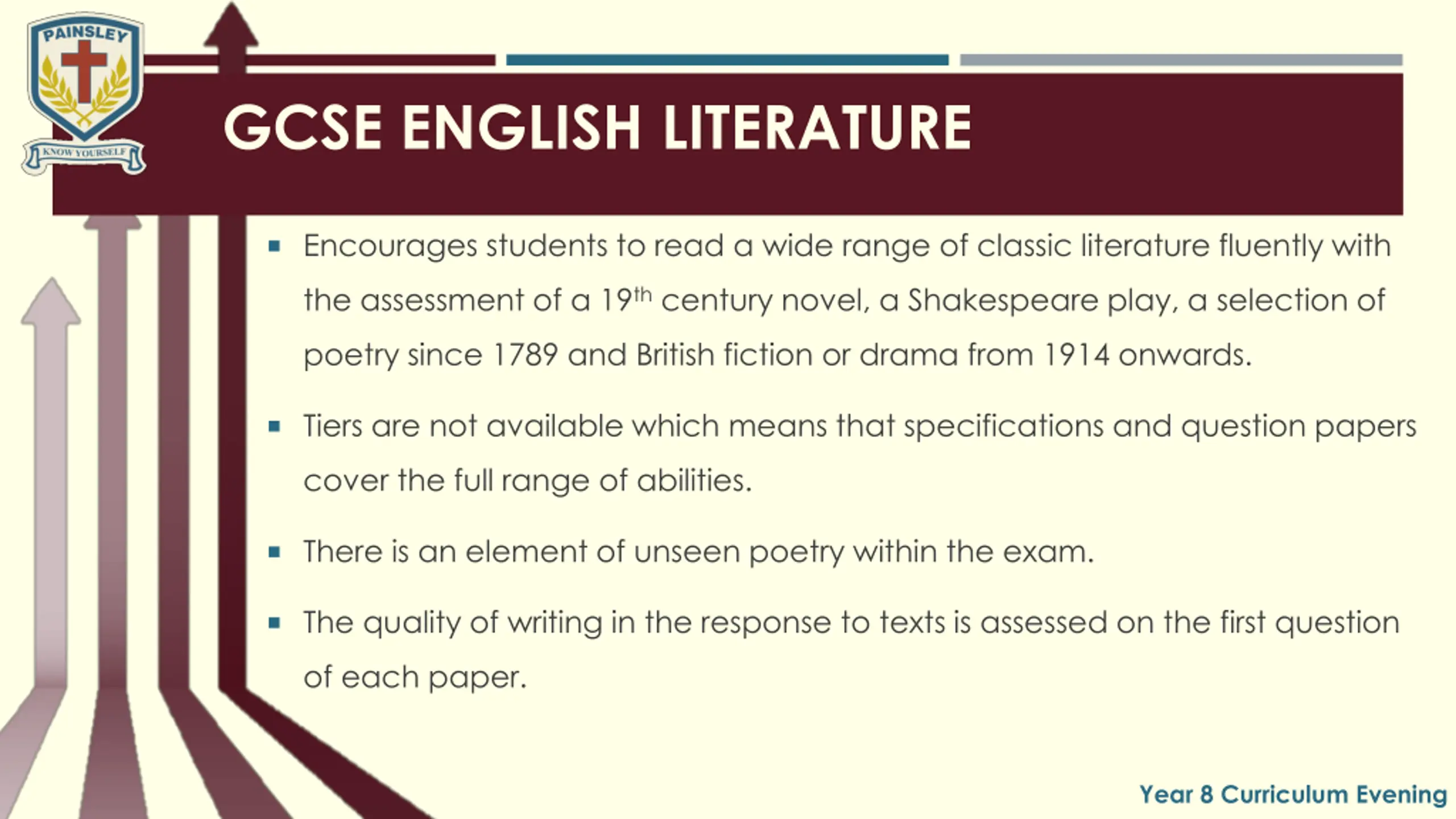 GCSE ENGLISH LITERATURE Encourages students to read a wide range of classic literature fluently with the assessment of a 19th century novel, a Shakespeare play, a selection of poetry since 1789 and British fiction or drama from 1914 onwards. Tiers are not available which means that specifications and question papers cover the full range of abilities. There is an element of unseen poetry within the exam. The quality of writing in the response to texts is assessed on the first question of each paper. Year 8 Curriculum Evening