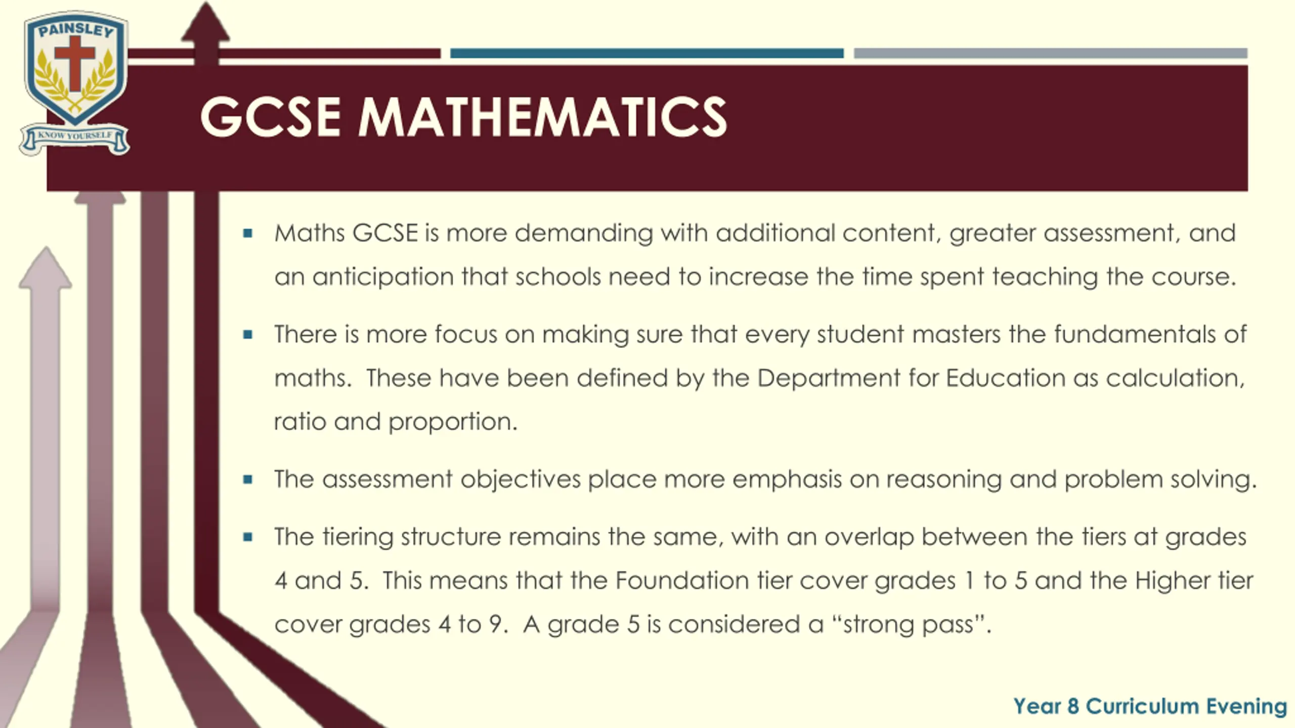 GCSE MATHEMATICS Maths GCSE is more demanding with additional content, greater assessment, and an anticipation that schools need to increase the time spent teaching the course. There is more focus on making sure that every student masters the fundamentals of maths. These have been defined by the Department for Education as calculation, ratio and proportion. The assessment objectives place more emphasis on reasoning and problem solving. The tiering structure remains the same, with an overlap between the tiers at grades 4 and 5. This means that the Foundation tier cover grades 1 to 5 and the Higher tier cover grades 4 to 9. A grade 5 is considered a strong pass . Year 8 Curriculum Evening