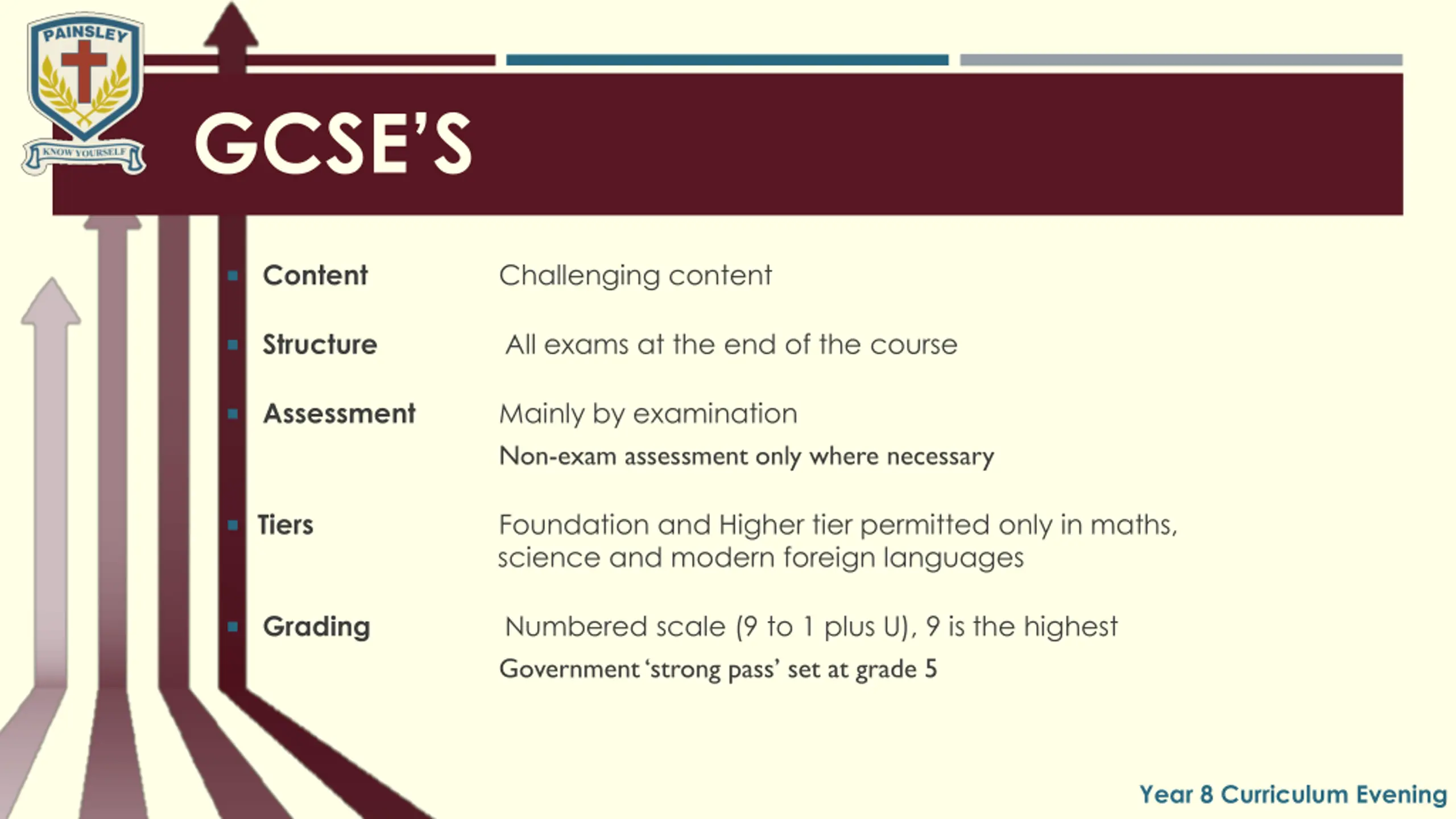 GCSES Content Challenging content Structure All exams at the end of the course Assessment Mainly by examination Non-exam assessment only where necessary Tiers Foundation and Higher tier permitted only in maths, science and modern foreign languages Grading Numbered scale (9 to 1 plus U), 9 is the highest Government strong pass set at grade 5 Year 8 Curriculum Evening