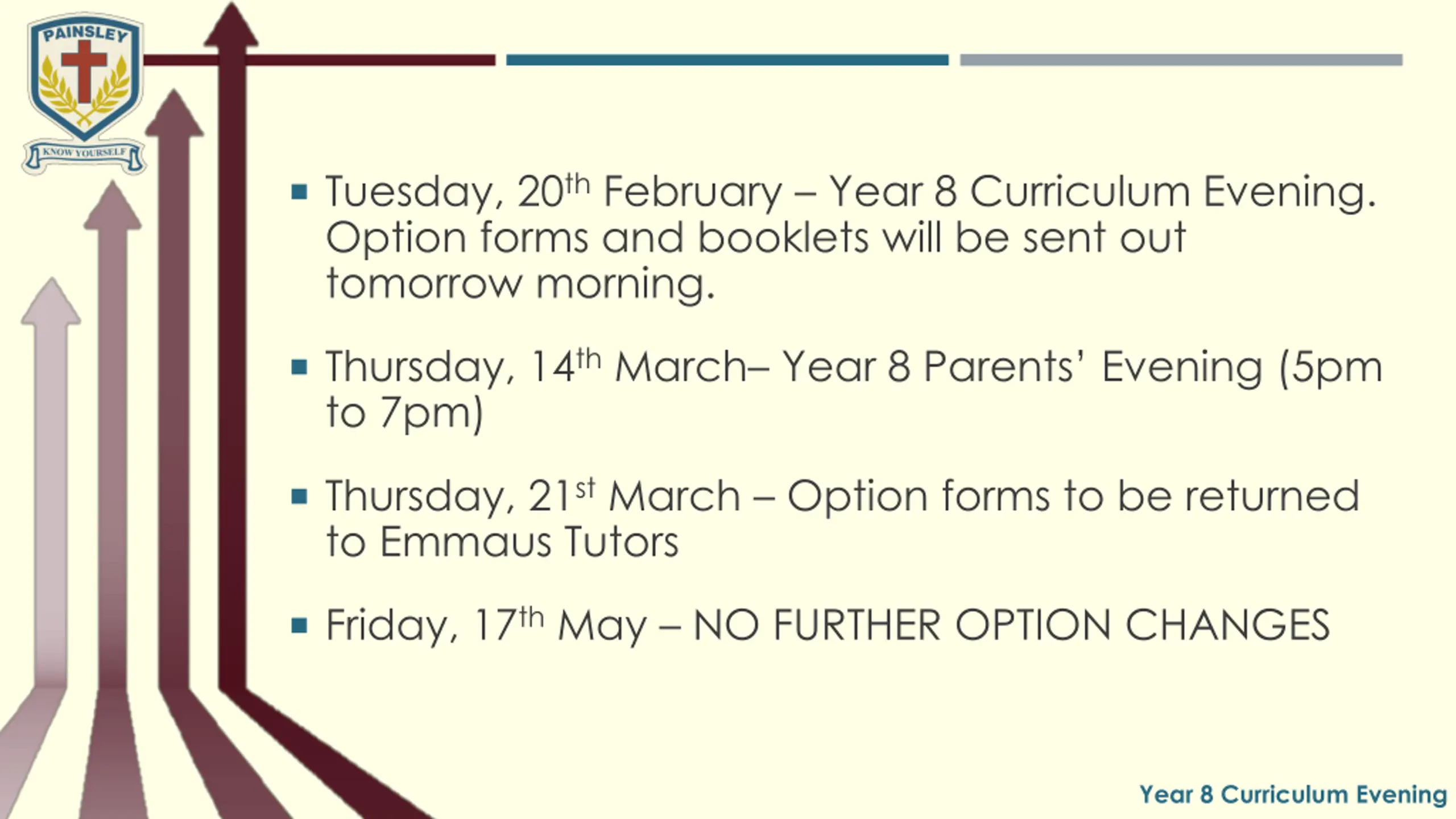 IMPORTANT DATES Tuesday, 20th February Year 8 Curriculum Evening. Option forms and booklets will be sent out tomorrow morning. Thursday, 14th March Year 8 Parents Evening (5pm to 7pm) Thursday, 21st March Option forms to be returned to Emmaus Tutors Friday, 17th May NO FURTHER OPTION CHANGES Year 8 Curriculum Evening