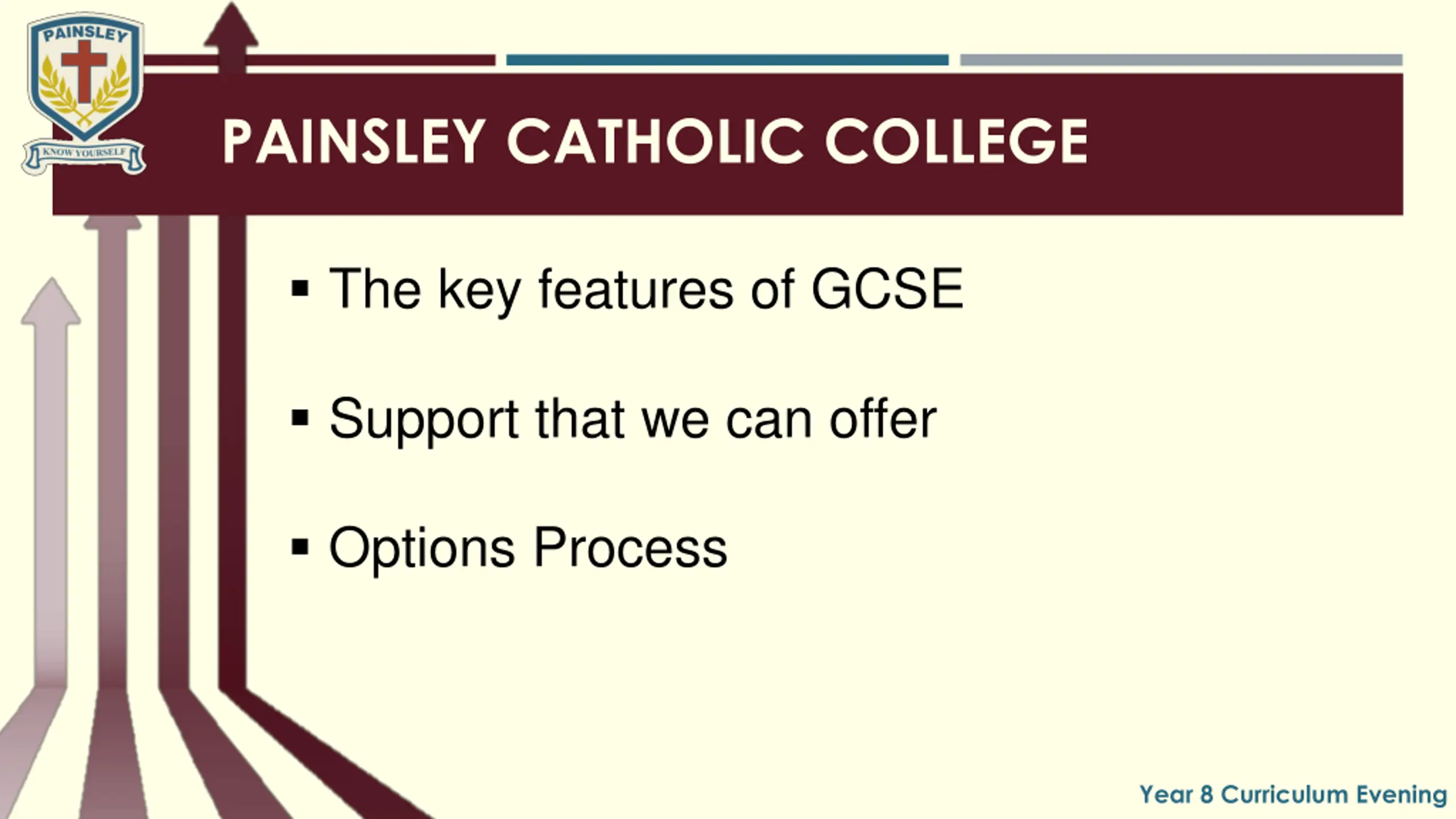 PAINSLEY CATHOLIC COLLEGE The key features of GCSE Support that we can offer Options Process Year 8 Curriculum Evening