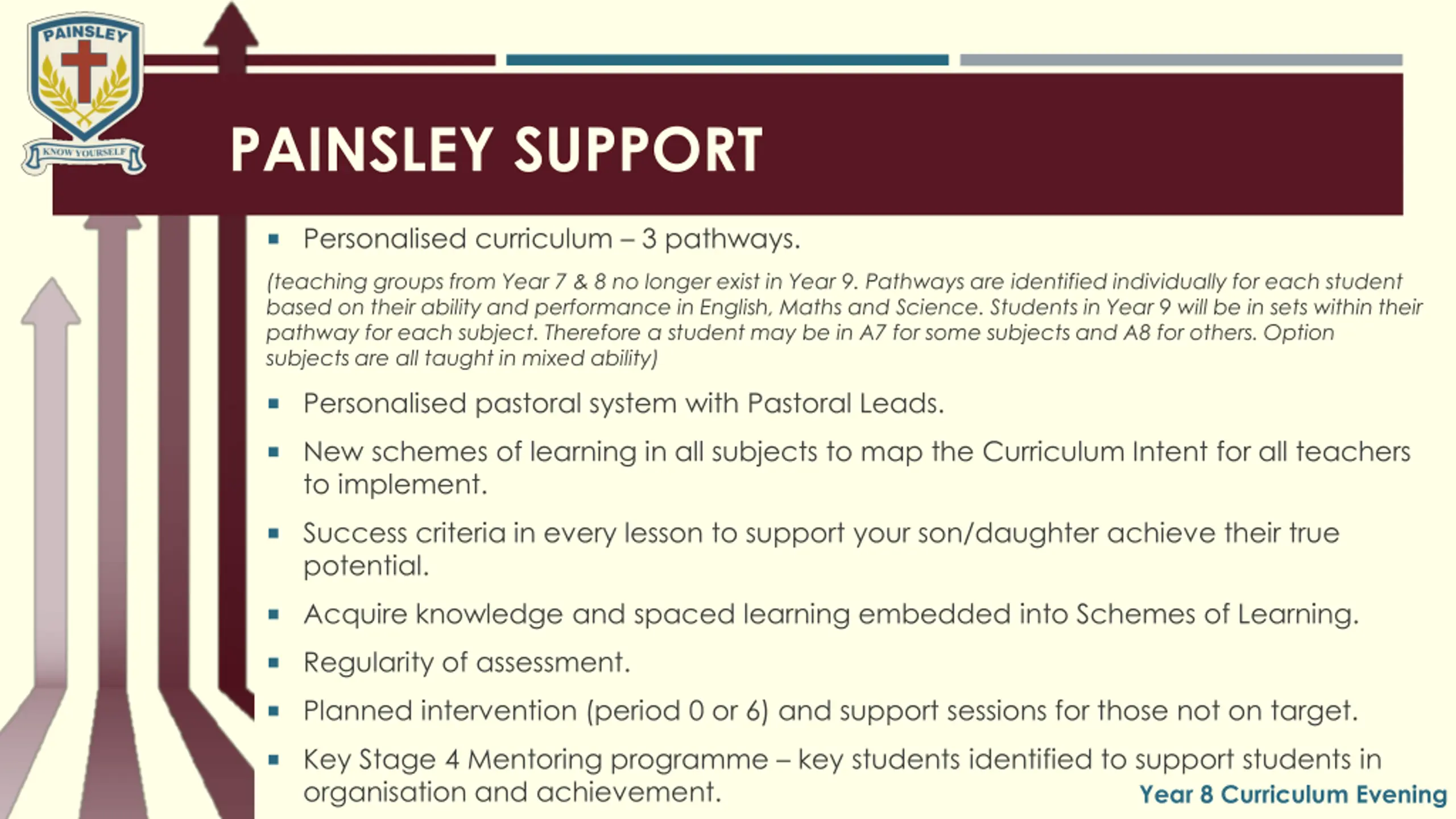 PAINSLEY SUPPORT Personalised curriculum 3 pathways. (teaching groups from Year 7 & 8 no longer exist in Year 9. Pathways are identified individually for each student based on their ability and performance in English, Maths and Science. Students in Year 9 will be in sets within their pathway for each subject. Therefore a student may be in A7 for some subjects and A8 for others. Option subjects are all taught in mixed ability) Personalised pastoral system with Pastoral Leads. New schemes of learning in all subjects to map the Curriculum Intent for all teachers to implement. Success criteria in every lesson to support your son/daughter achieve their true potential. Acquire knowledge and spaced learning embedded into Schemes of Learning. Regularity of assessment. Planned intervention (period 0 or 6) and support sessions for those not on target. Key Stage 4 Mentoring programme key students identified to support students in organisation and achievement. Year 8 Curriculum Evening
